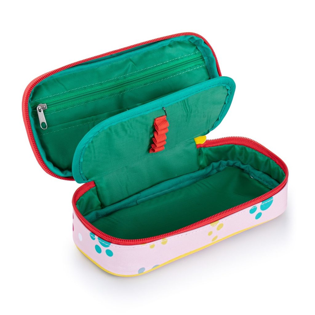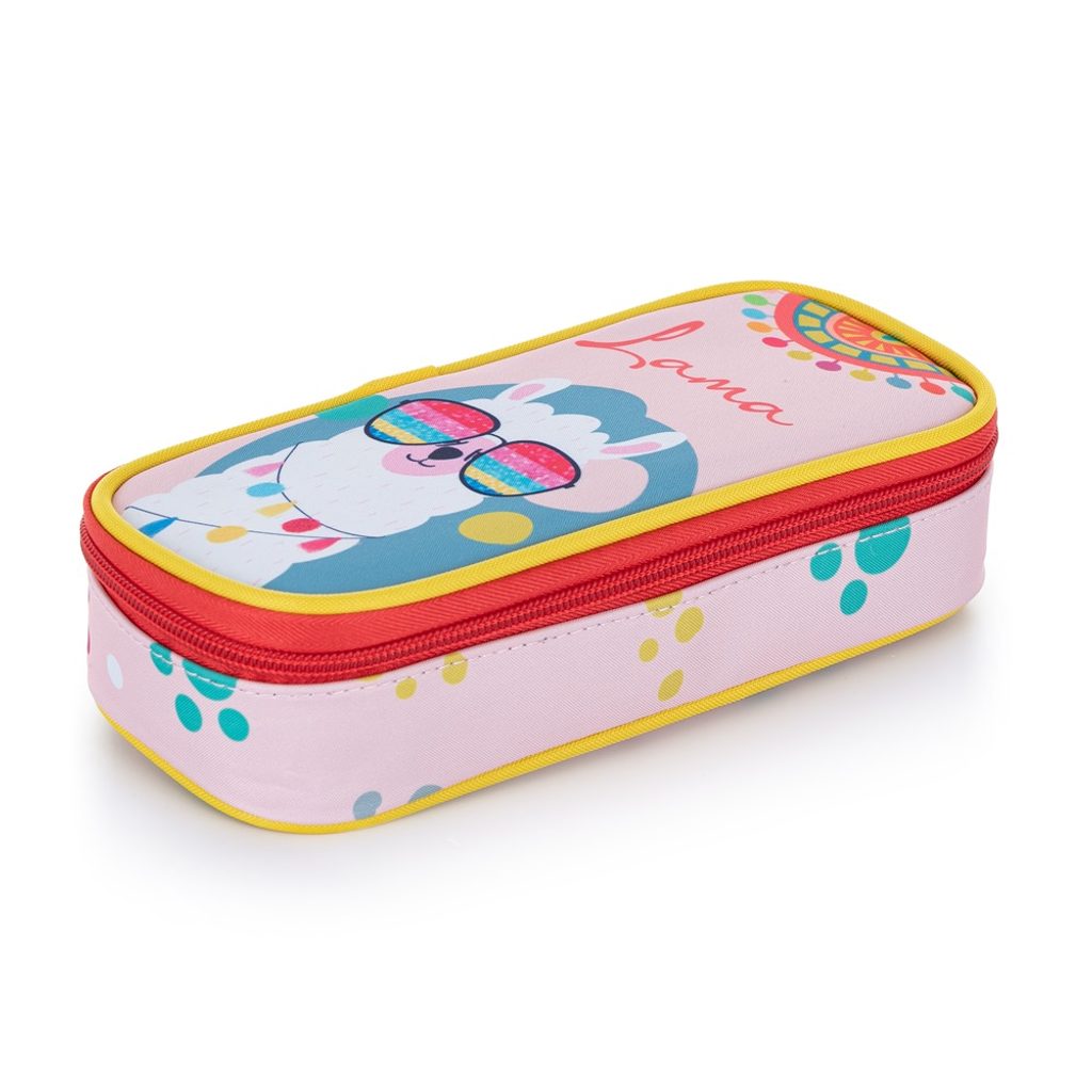 Školní pouzdro etue s motivem lamy. Pouzdro je opatřeno pevnými zipy, kapsičkou na zip a klopou s pevnými poutky po obou stranách. Pod klopou je místo pro volné uložení psacích potřeb nebo jiných drobností. Vhodné pro školáky na 2. stupni a starší studenty.