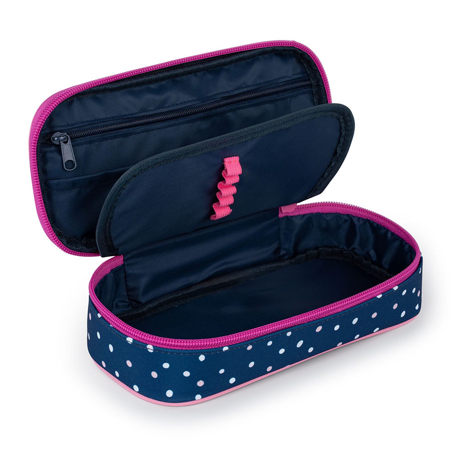 Školní pouzdro etue je opatřeno pevnými zipy, kapsičkou na zip a klopou s pevnými poutky po obou stranách. Pod klopou je místo pro volné uložení psacích potřeb nebo jiných drobností. Vhodné pro školáky na 2. stupni a starší studenty.