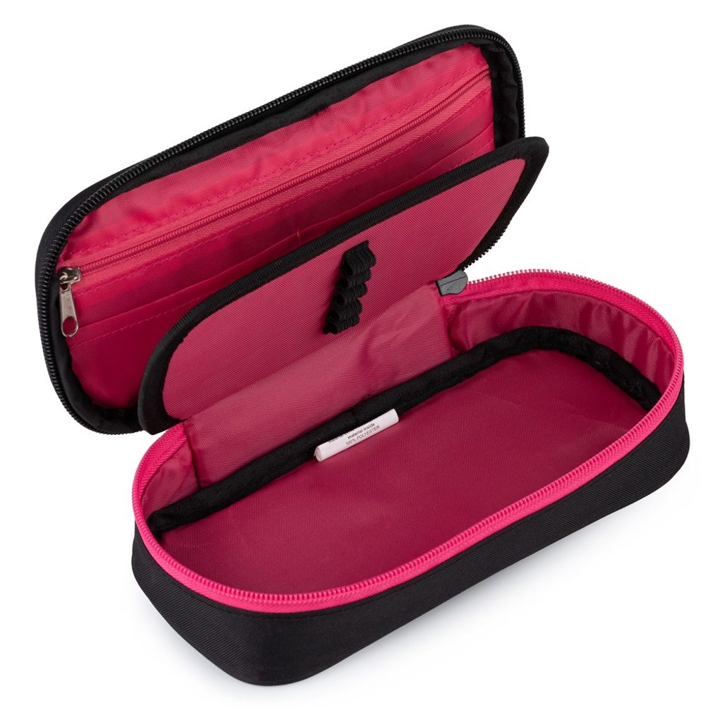 Školní pouzdro etue OXY v růžovém provedení. Pouzdro je opatřeno pevnými zipy, kapsičkou na zip a klopou s pevnými poutky po obou stranách. Pod klopou je místo pro volné uložení psacích potřeb nebo jiných drobností. Vhodné pro školáky na 2. stupni a starší studenty.