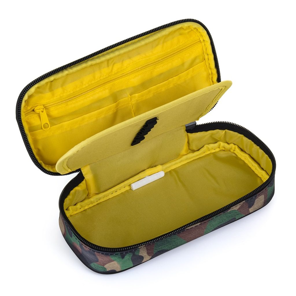 Školní pouzdro etue s motivem T-rexe. Pouzdro je opatřeno pevnými zipy, kapsičkou na zip a klopou s pevnými poutky po obou stranách. Pod klopou je místo pro volné uložení psacích potřeb nebo jiných drobností. Vhodné pro školáky na 2. stupni a starší studenty.