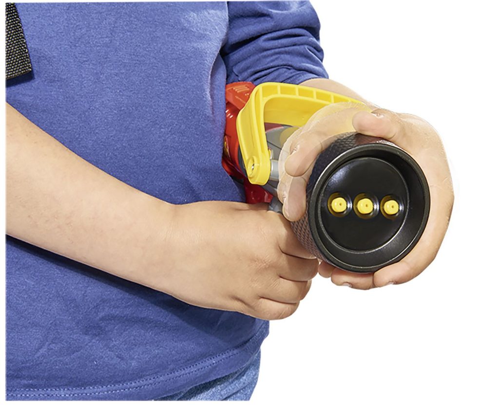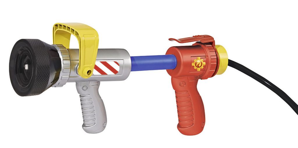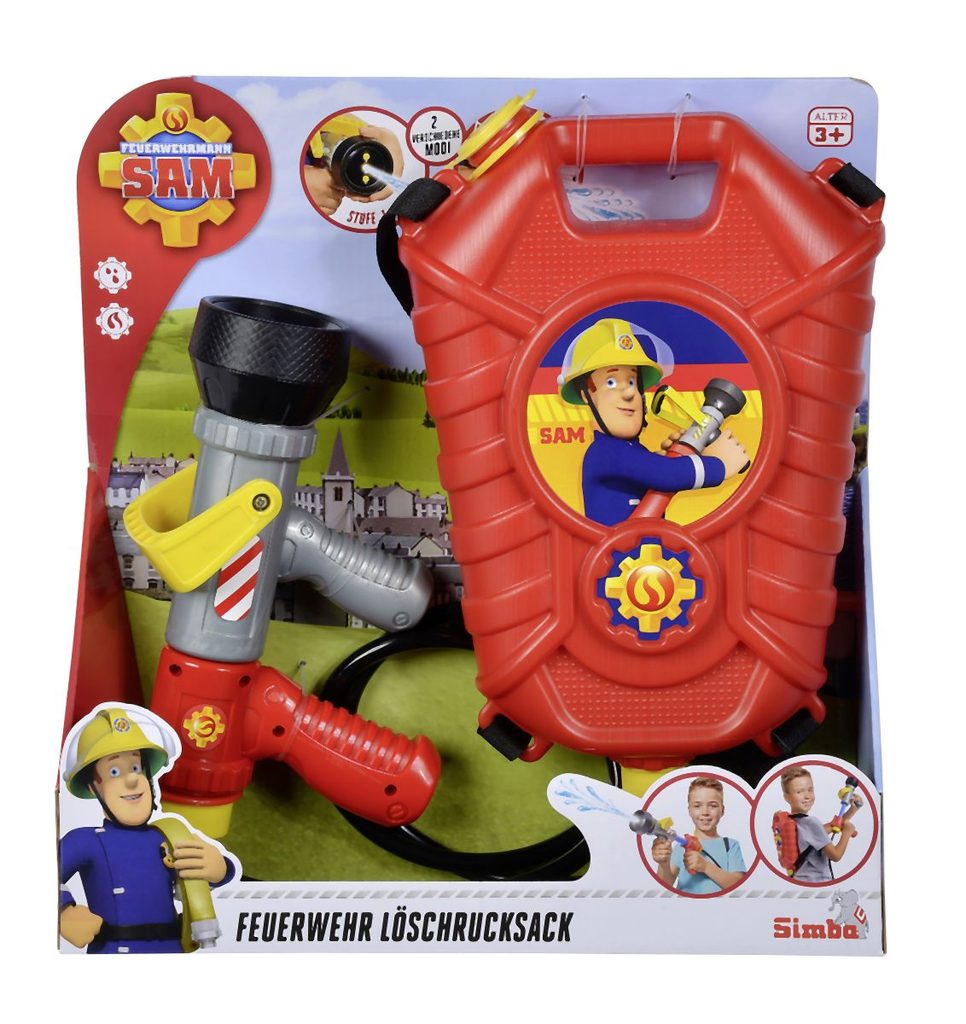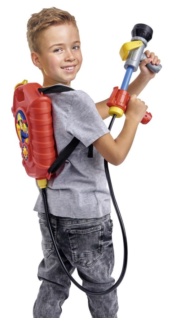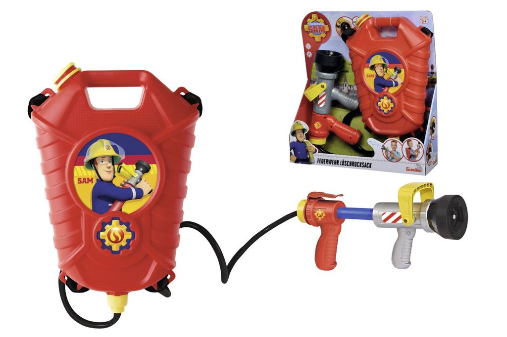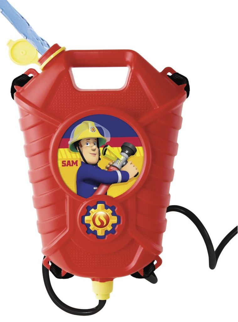 Hasicí sada na záda v licenci Požárník Sam s jednorázovým nebo vícenásobným prouděním vody. Zásobník na vodu 1800 ml. Velikost pistole 23 cm. Dosah až 10 m.
