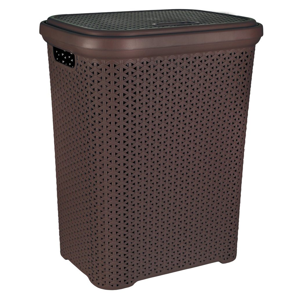Koš na prádlo s odklápěcím víkem. Materiál: plast. Dekor ratanu. Rozměry: 44x33x56 cm.