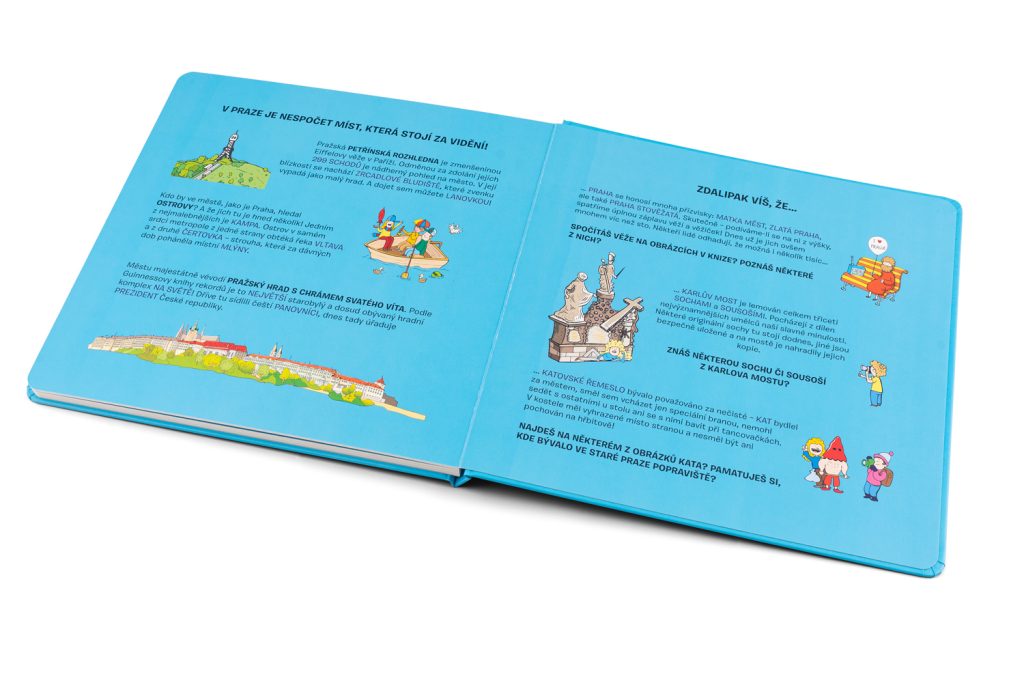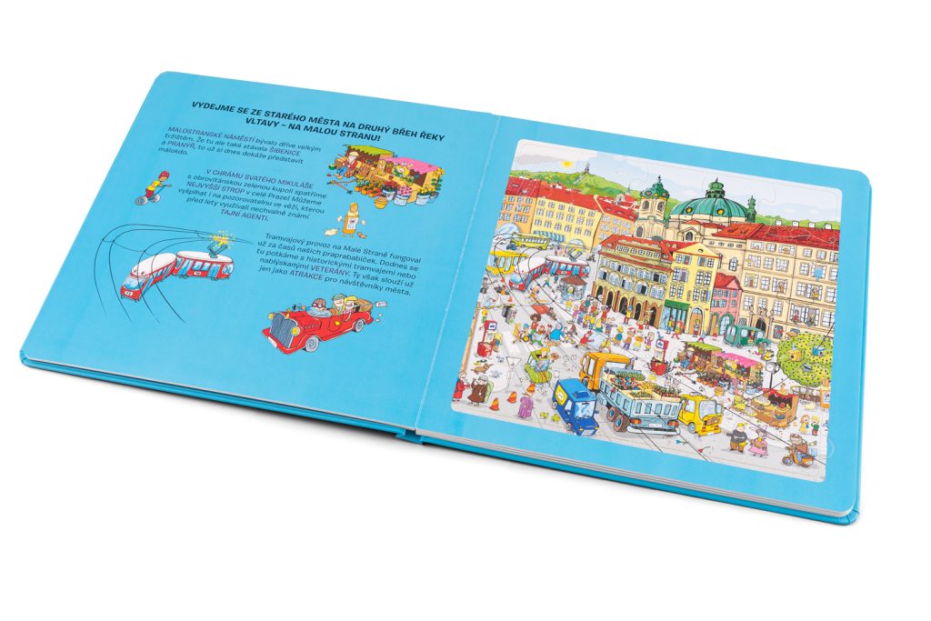 Tato knížka představuje nejkrásnější místa a zákoutí našeho hlavního města – stověžaté Prahy. Navštívíte zde Karlův most a pokocháte se výhledem na Pražský hrad. Zavítáte na Malostranské náměstí s majestátním chrámem svatého Mikuláše a samozřejmě na nejstarší náměstí Prahy – Staroměstské náměstí se světoznámým a turisty obdivovaným orlojem. Prohlídku města jistě rádi zakončíte oddychem ve Stromovce – největší z pražských zahrad. Na cestě za poznáním vás doprovodí řada komických postaviček i pražských přízraků.Pod barevnými puzzle skládankami objeví děti černobílé obrázky, které jim poslouží jako nápověda při skládání, ale mohou si je také samy vybarvit. A na posledních stránkách čekají malé čtenáře jednoduché kvízové otázky!