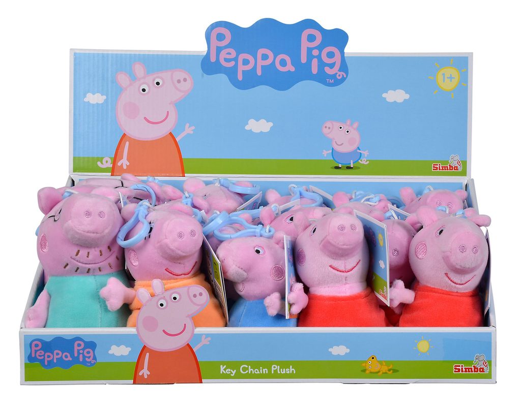 Přívěsek na batoh - hrdinové seriálu Prasátko Peppa - displej obsahuje Peppu (9x) a prasátko Toma, maminku Prasátko a tatínka Prasátko (každý 3x), Výška: 10-13cm. Displej 18 ks.
