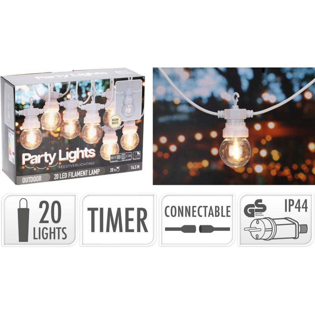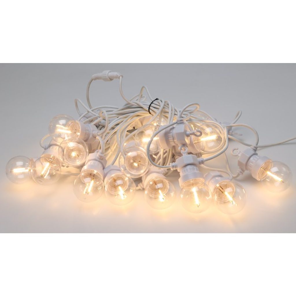 Elegantní světelný řetěz s 20 koulemi G50 vyzařujícími příjemné teplé bílé světlo. Každá koule obsahuje jedno LED vlákno, které vytváří jemný a rovnoměrný světelný efekt. Řetěz je připojitelný, vybavený časovačem a bezpečným transformátorem s ochranou IP44. Díky bílému kabelu a decentnímu designu se skvěle hodí pro vnitřní i venkovní dekorace.