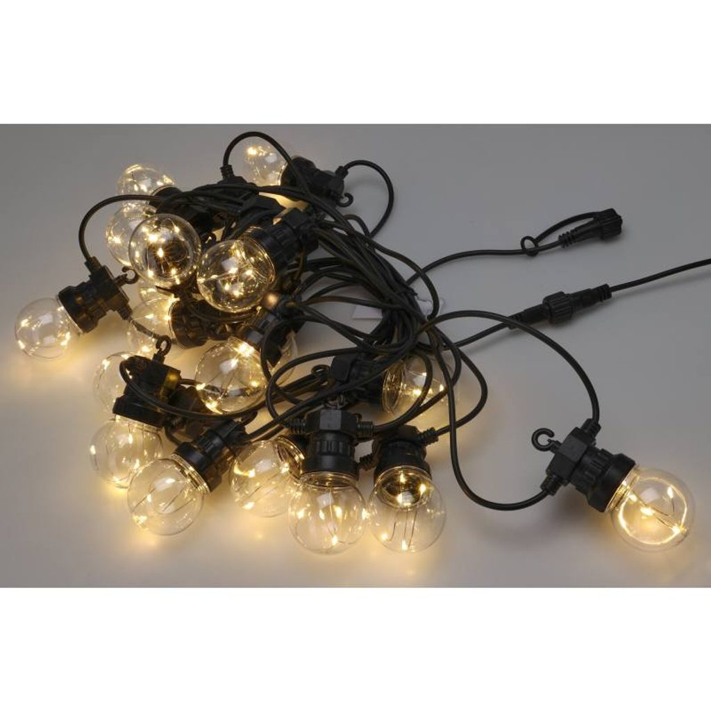 Elegantní světelný řetěz s 20 koulemi vyzařujícími teplé bílé světlo. Každá koule obsahuje 5 mini LED diod na měděném drátku, které vytvářejí příjemnou atmosféru pro interiér i exteriér. Řetěz je připojitelný, vybavený časovačem a odolným transformátorem s ochranou IP44. Ideální pro vánoční dekorace, terasy či zahradní posezení.