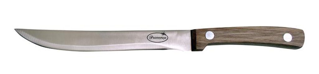 Plátkovací nůž z nerezové oceli, délka čepele 18, 5 cm, rukojeť ze dřeva, slouží k plátkování masa. Rozměry nože - 31,5 x 2,2 cm.