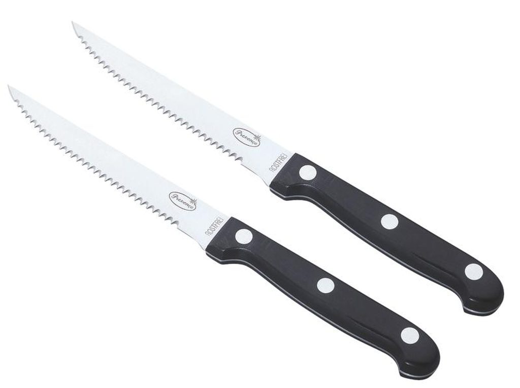 Steakový nůž 2ks, délka ostří 11, 4 cm, opatřena zoubky pro snadné krájení masa, netupí se, z kvalitní nerez oceli, rukojeť z tvrdého, odolného černého plastu, vhodný jako příborový nůž na krájení masa a zeleniny. Vhodný do myčky na nádobí. Rozměry - 21, 8 x 1, 6 cm.