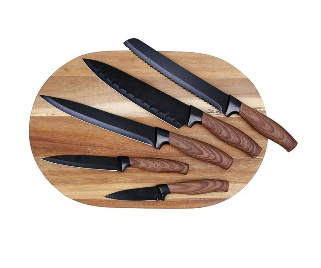 Sada nožů PROVENCE EXCLUSIVE obsahuje 5 ks nejpoužívanějších nožů. Nože mají ergonomickou rukojeť s imitací dřeva, ostrou čepel s nepřilnavým povrchem. Jsou vysoce odolné a snadno se čistí. Sada obsahuje 5 ks nožů: kuchařský nůž: široká, špičatá čepel určena k sekání, krájení na kostičky či plátky a k drcení, nůž na chléb: zoubkovaná či zvlněná čepel, která si snadno poradí s tvrdou kůrkou i měkkou střídkou, porcovací nůž: úzký nůž s dlouhou čepelí a ostrou špičkou určený na krájení masa i porcování pečeně, univerzální nůž: kvalitní víceúčelový nůž vhodný na krájení a ořezávání masa či velkých kusů zeleniny, loupací nůž: malý špičatý nůž na ovoce a zeleninu.