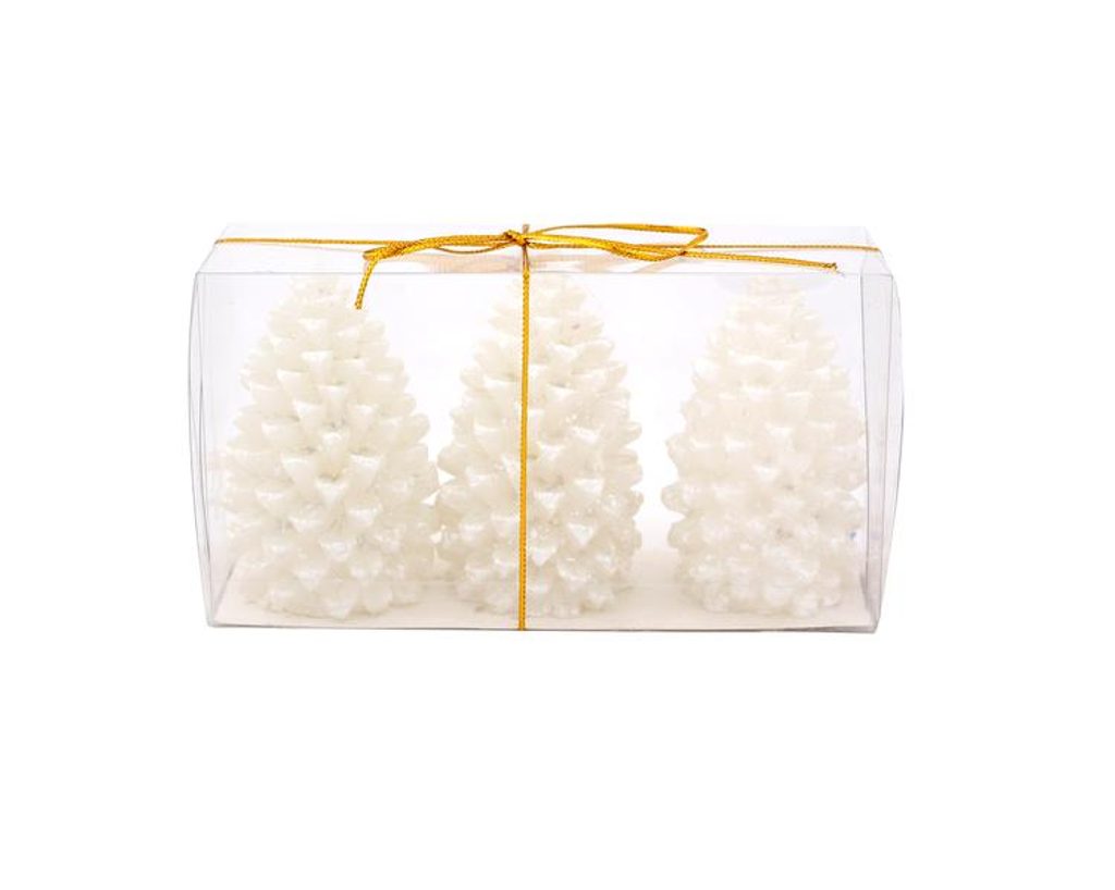 Sada 3 ks vánočních svíček ve tvaru šišky. Hodí se na každý vánoční stůl, kde navodí tu pravou sváteční atmosféru. Materiál - parafín. Barva bílá.