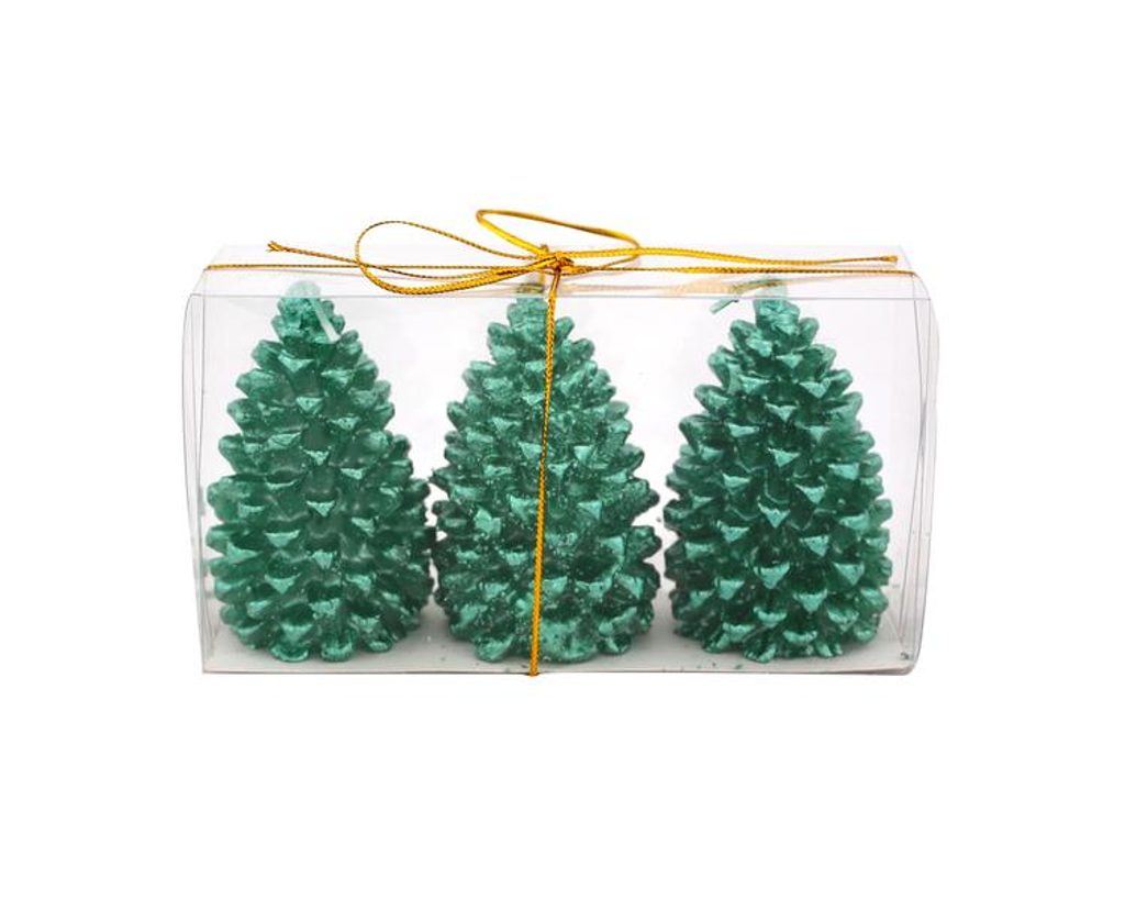 Sada 3 ks vánočních svíček ve tvaru šišky. Hodí se na každý vánoční stůl, kde navodí tu pravou sváteční atmosféru. Materiál - parafín. Barva zelená.
