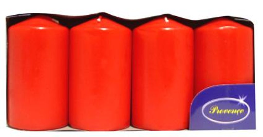 Svíčka válec - 4 ks. Jednoduchý zdroj světla, který navodí ve Vašem domově příjemnou atmosféru. Svíčka je zároveň vhodná na vytváření vánočních, velikonočních, ale i jiných arengema. Nezapomeňte prosím dbát na bezpečnost a držte se na svíčce uvedených bezpečnostních piktogramů. Rozměry svíčky - 5 x 9 cm. Barva červená.