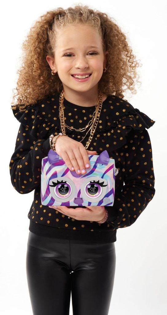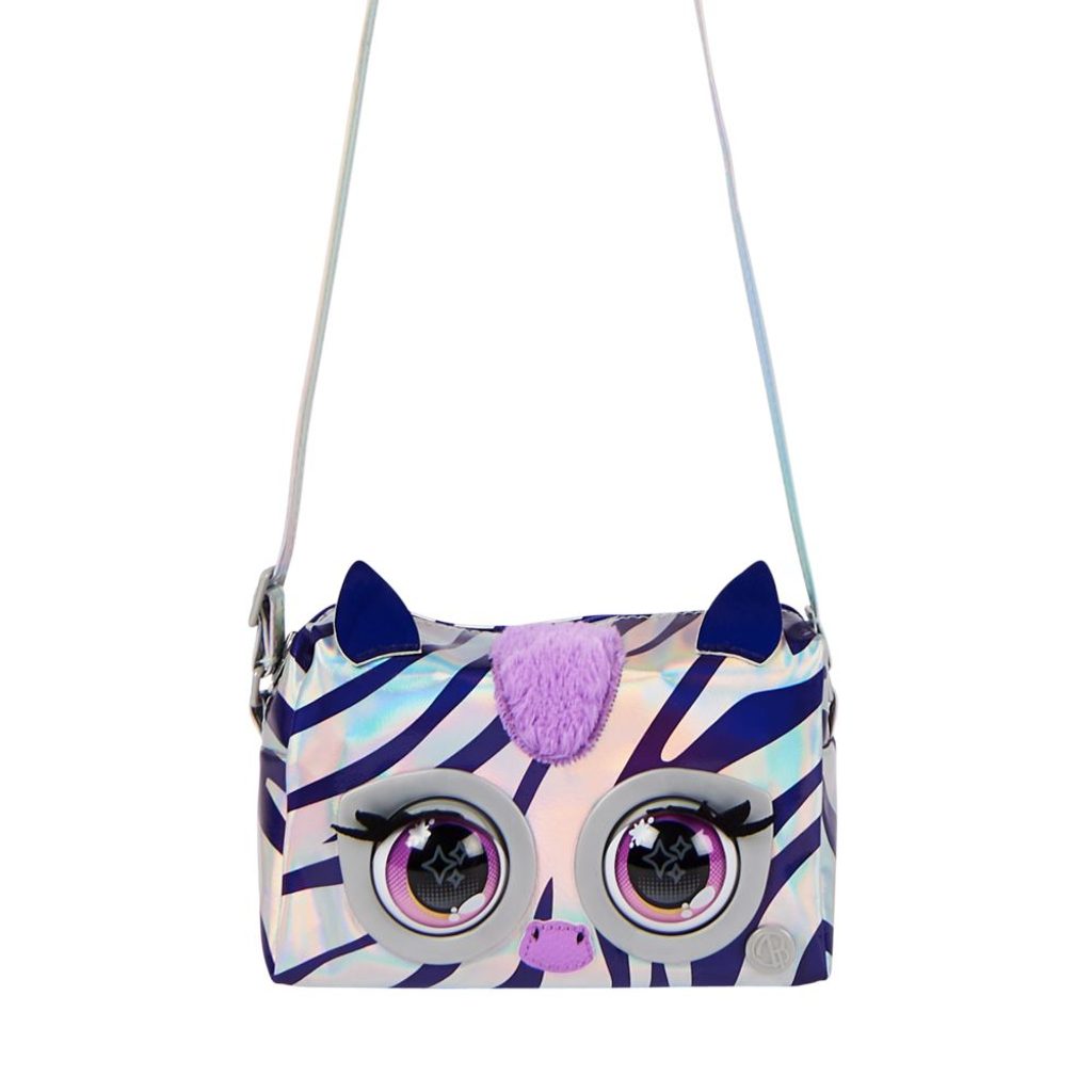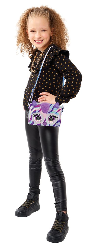 Interaktivní kabelka Zebra má veliké mrkací oči, které reagují na dotykový senzor. Pomocí dalších dotyků aktivuj až 30 různých zvuků a reakcí. Je vyrobená z lesklé stříbrné lakované látky s měňavými fialovými pruhy, má nadýchanou hřívu, kovové doplňky a nastavitelný popruh. Velikost 11 x 16 x 6,5 cm. Vhodné od 5 let.