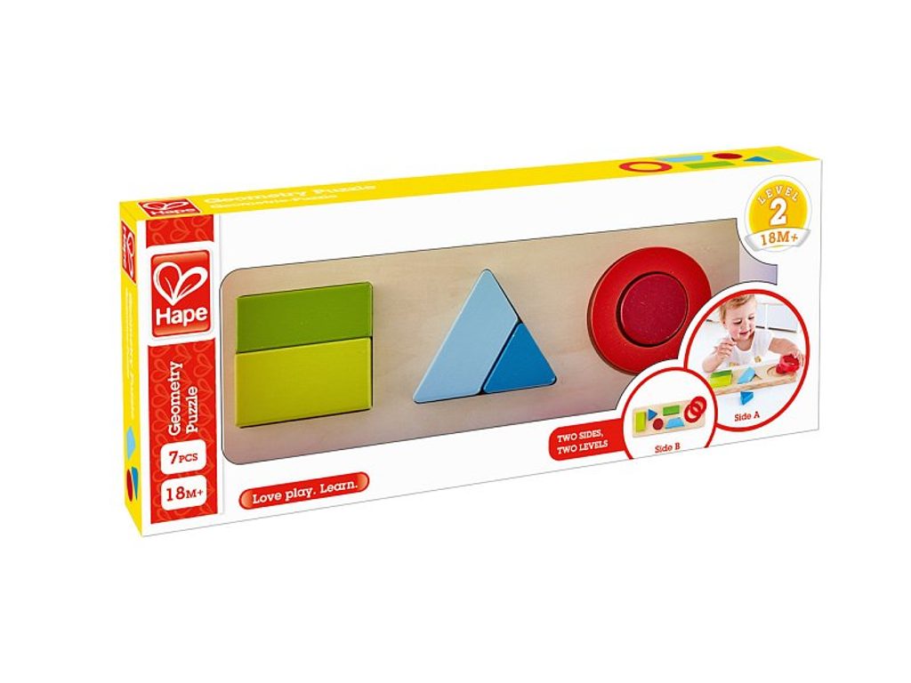 Skládání puzzle je zábava! S puzzlem geometrické tvary se nudit nebudete. Puzzle obsahuje dvě úrovně obtížnosti. Hračka je vyrobena z kvalitního a odolného dřevěného materiálu. Poutavé barevné provedení je vhodné pro kluky i holčičky. Počet dílků: 7. Rozměr: 28 x 10 x 2,3 cm. Věk: 18m+