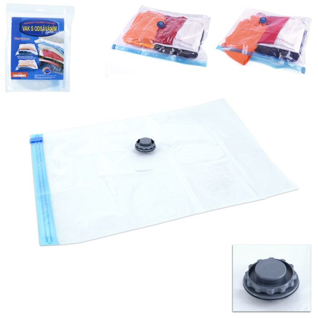 Odsávací vak je vhodný pro uskladnění sezónních oděvů, lůžkovin, textilních i plyšových hraček. Po odsátí vzduchu z vaku pomocí vysavače nebo pumpičky na odsávání vaku se objem vaku výrazně zmenší a Vy ušetříte místo na ukládání. Oděvy zároveň chráníte před roztoči, moly i prachem. Materiál: plast. Rozměry: 70x100 cm. pytel 1ks 70x100cm vakuový Space