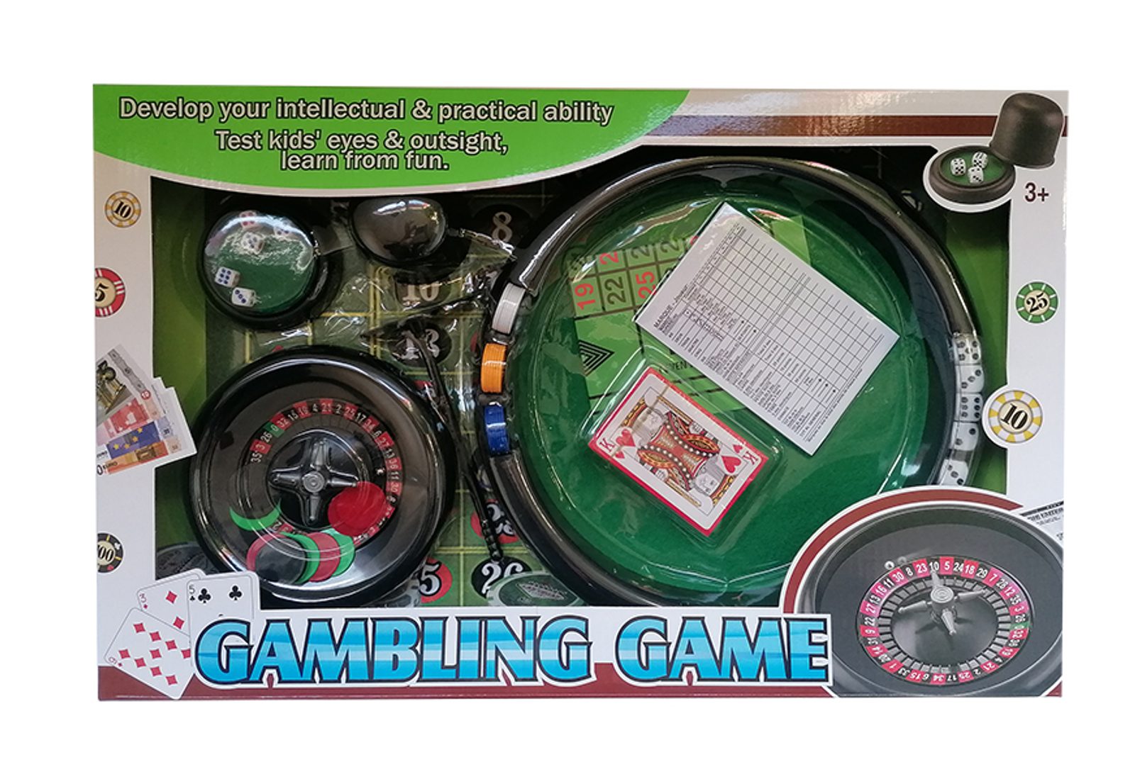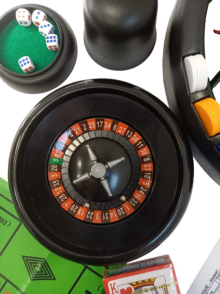 Jedinečná "hazardní" sada, pomoci které si můžete zahrát na světová kasina, kde se točí spousta peněz. Součástí balení je ruleta s žetony, karty, kostky a další. Vhodné pro děti od 8-mi let.
