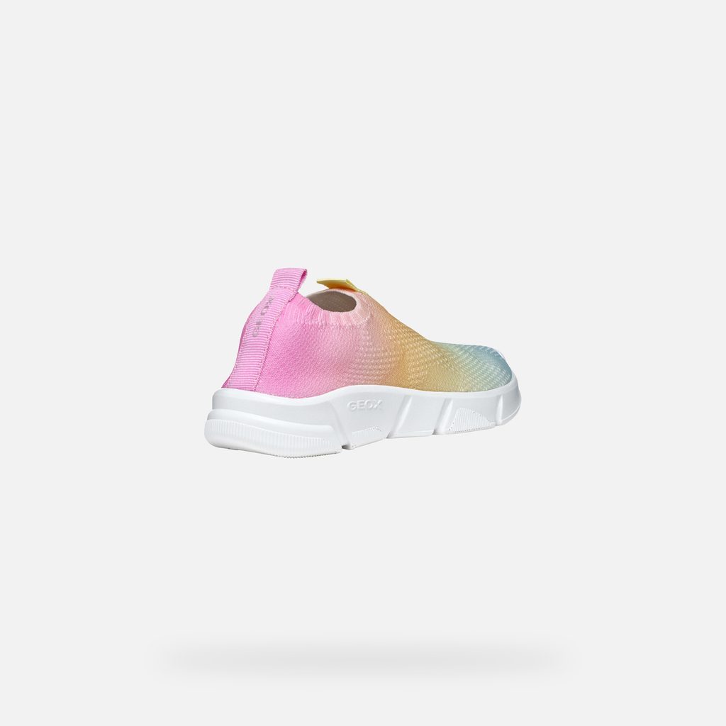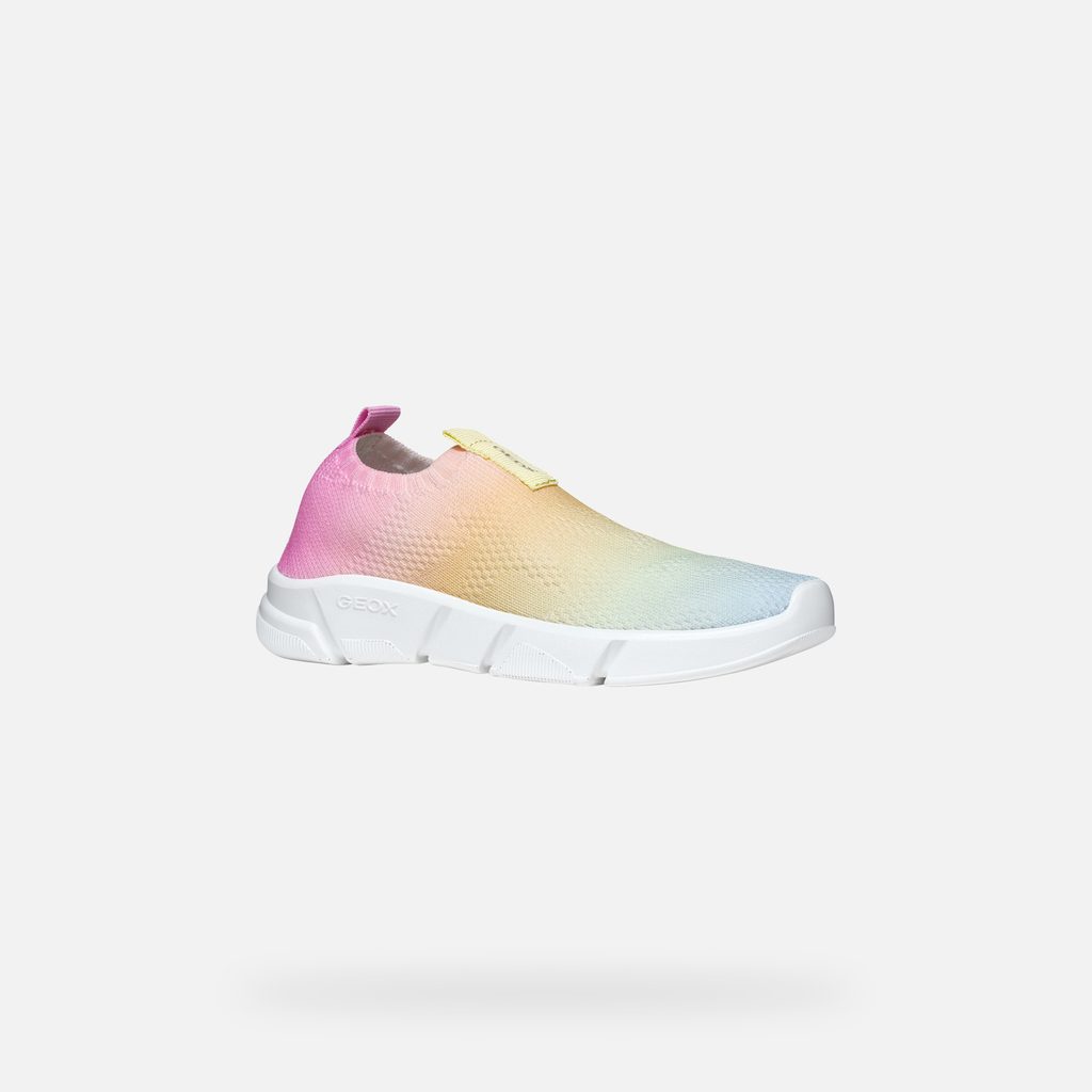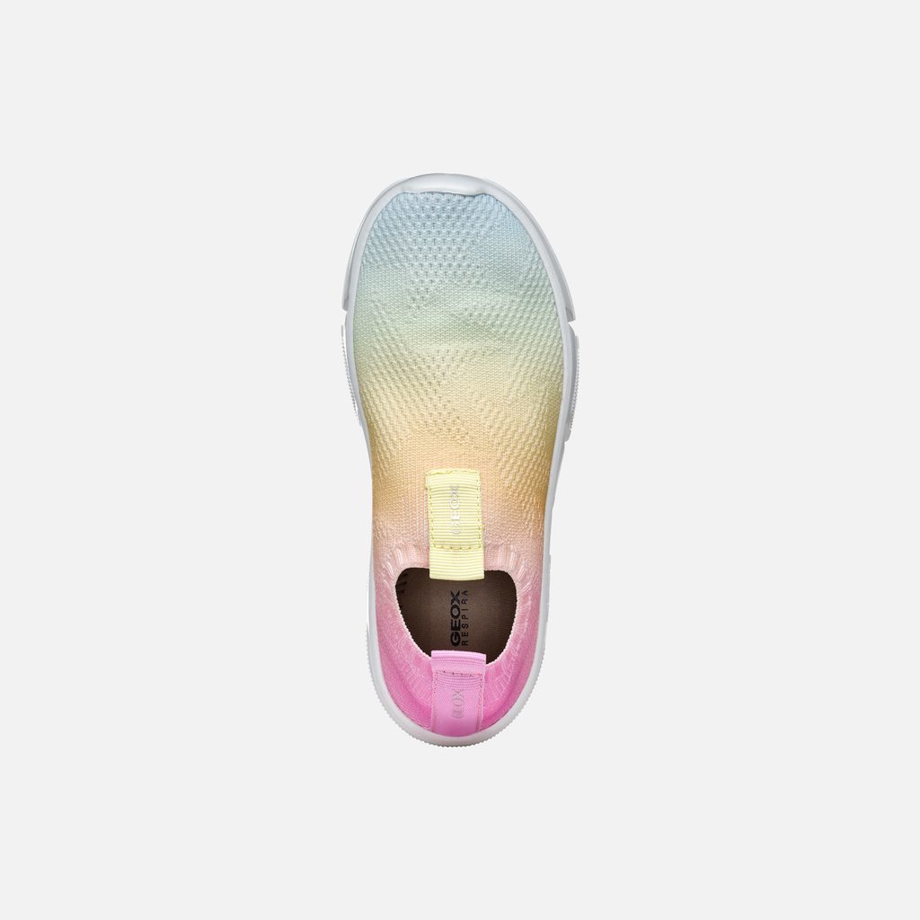 Dívčí slip-on tenisky Geox Aril v něžném barevném provedení zaujmou originálním přechodem z růžové přes žlutou až do světle modré. Designový kousek zdobí pletený svršek a geometricky členěná bílá podrážka s logem značky.
