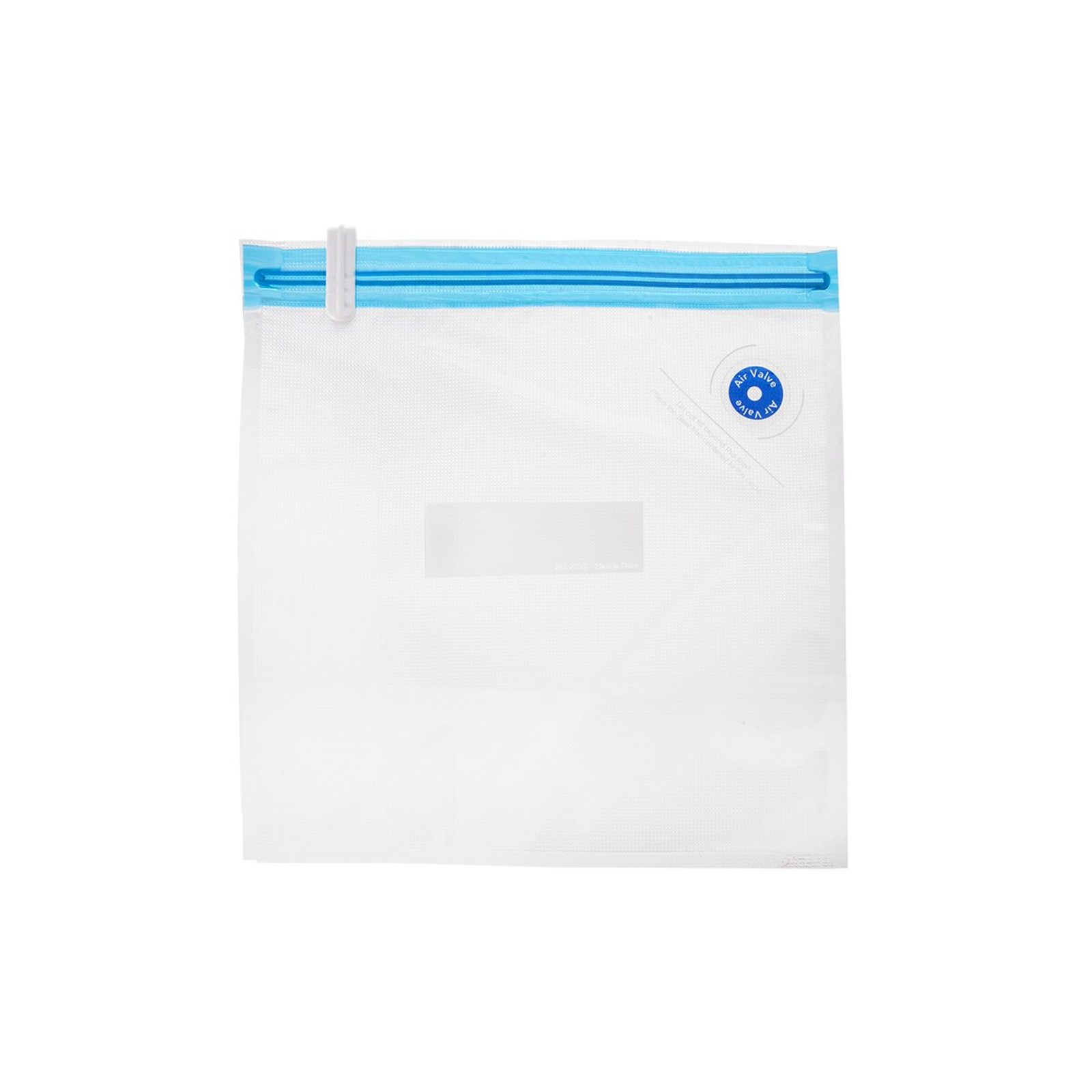 Uzavíratelné vakuovací sáčky do vakuovaček potravin se zipovým uzávěrem a vzduchotěsným odsávacím ventilem jsou vyrobeny ze speciální odolné fólie, kterou lze umývat a opakovatelně používat. Uloží potraviny v lednici, v mrazáku i v potravinové skříňce. Potraviny v nich vydrží až 5x déle čerstvé než v běžných sáčcích. Jedna strana transparentní, druhá má speciální vroubky pro snadné a rychlé vakuování. Barevný štítek umožňuje zapsání data uchování nebo vyznačení druhu potravin. Sada 10 ks. Součástí jsou 2 plastové jezdce pro snadnější uzavírání. Použití od -20 °C do +110 °C. Plňte pouze po vyznačenou rysku. Neobsahuje BPA. Materiál: nylon (PA)-PE. Rozměry: 21x22 cm (+/- 0,5 cm).