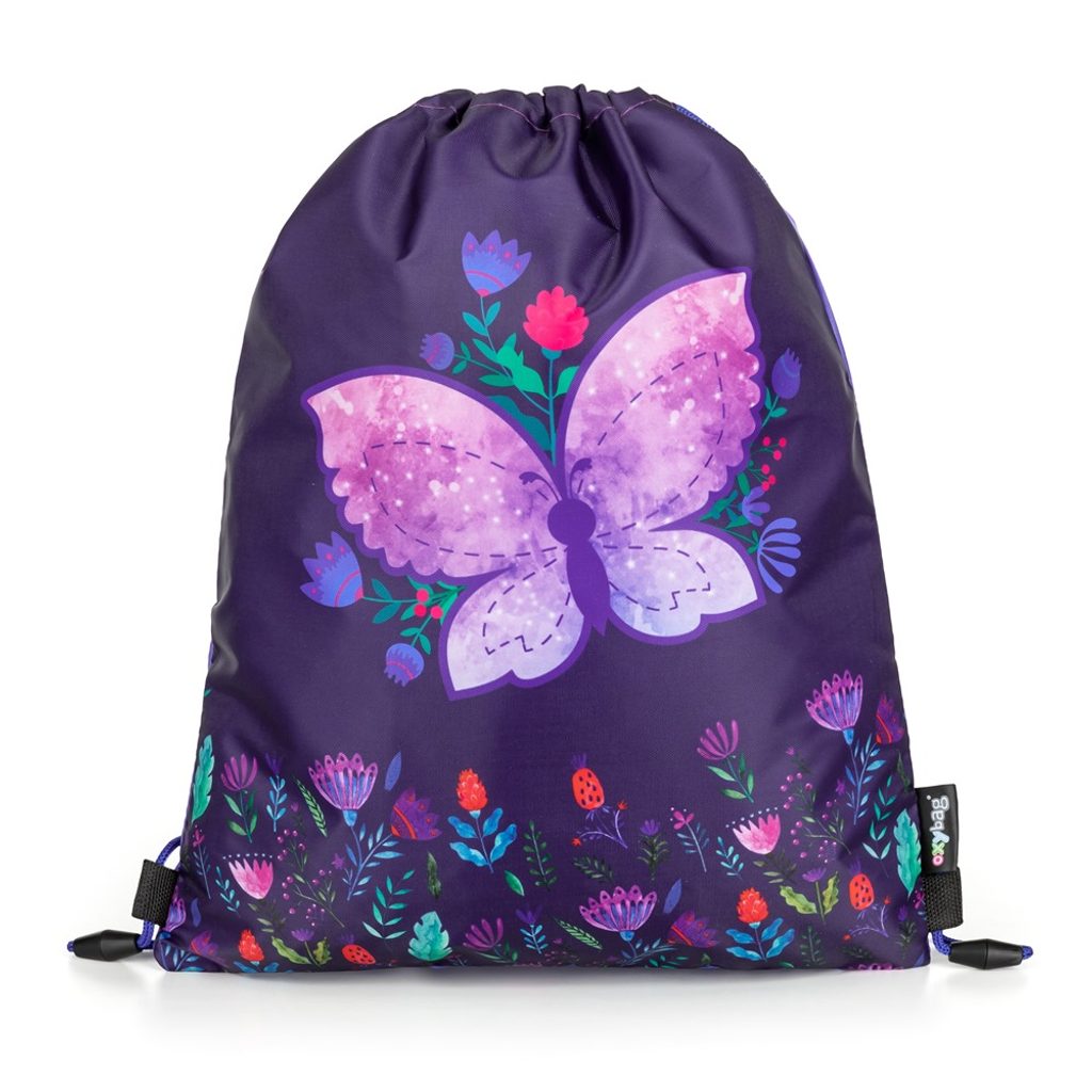 Sáček na přezůvky s motivem motýla. Uzavírání stažením šňůrek, možnost nosit i na zádech nebo připevnit ke školnímu batohu. Materiál 100% polyester.