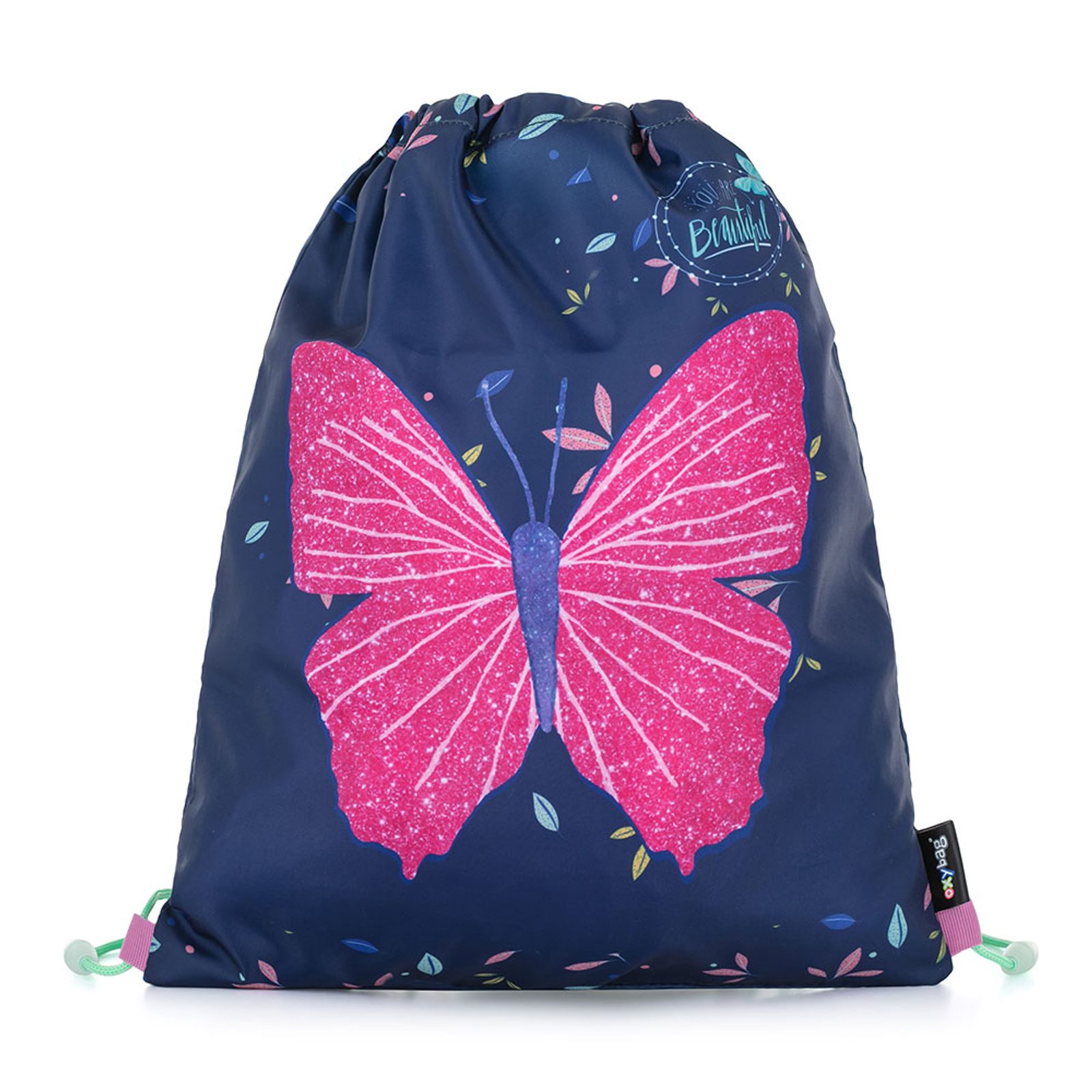 Sáček na přezůvky s motivem motýla. Uzavírání stažením šňůrek, možnost nosit i na zádech nebo připevnit ke školnímu batohu. Materiál 100% polyester.