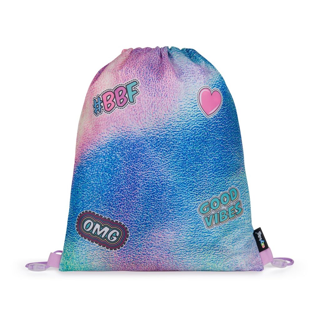 Sáček na přezůvky. Uzavírání stažením šňůrek, možnost nosit i na zádech nebo připevnit ke školnímu batohu. Materiál 100% polyester.