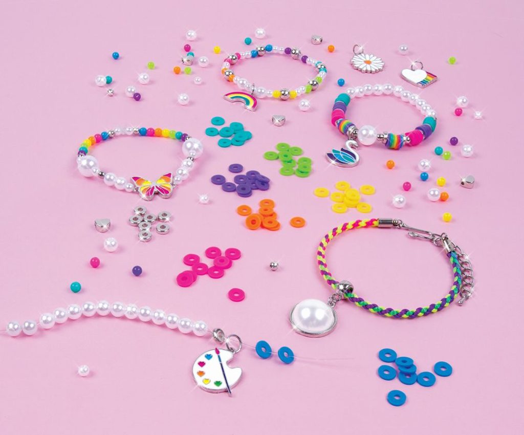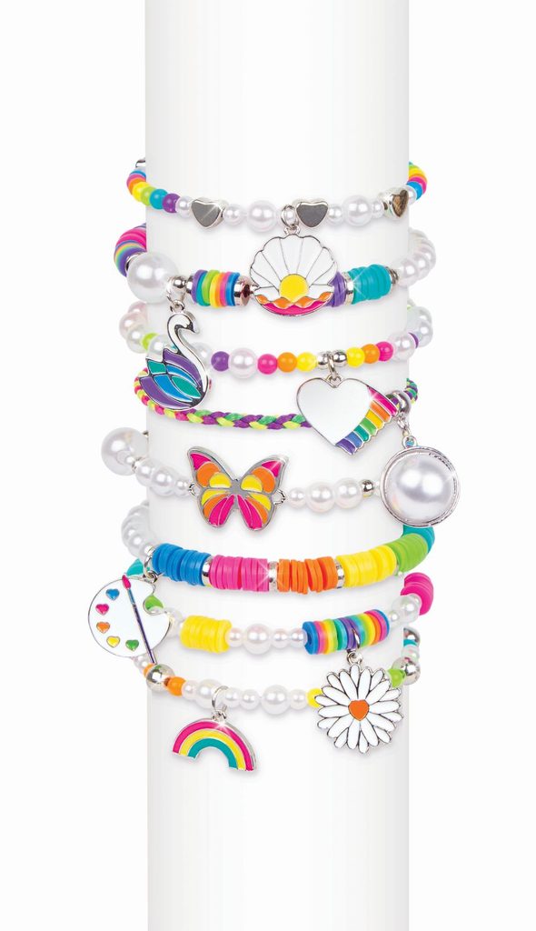 Sada obsahuje komponenty na výrobu osmi náramků. Oživte svůj svět kreativity a vyrobte si náramky dle vlastní představy. 8 způsobů, jak různě kombinovat perly a duhy vám určitě zlepší den. Sada obsahuje: 1 saténový náramek, 1 čirou elastickou šňůrku (3 m), 335 heishi korálků, 246 korálků, 5 stříbrných korálků ve tvaru srdce a 8 přívěšků. Vhodné pro děti od 8 let.