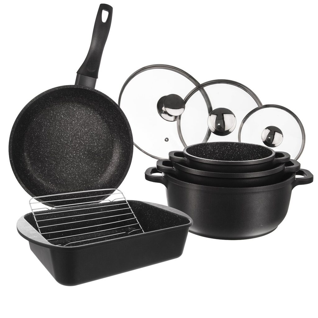 Sada nádobí – masivní hrnce s poklicí, pánev, pekáč a rošt s velmi kvalitním nepřilnavým povrchem PFLUON GRANIT. Můžete v něm vařit, smažit, dusit, opékat a zapékat s minimální potřebou tuku. Připravovaný pokrm se nepřipéká. Poklice s otvorem pro únik přebytečné páry. Vhodné na všechny typy spotřebičů včetně indukce (kromě pekáče) i trouby (kromě pánve). Materiál: hliník s vynikajícím nepřilnavým povrchem PFLUON GRANIT a s profilovaným dnem, sklo, nerez, plast. Rozměry: hrnec pr. 16 cm, v. 8/13 cm, o. 1,4 l, hrnec pr. 20 cm, v. 8,5/13,5 cm, o. 2,4 l, hrnec pr. 24 cm, v. 10,5/16 cm, o. 4,2 l, pánev pr. 24 cm, v. 5 cm, pekáč 35x22x8 cm, rošt 24x16,5 cm. Doporučujeme použití kuchyňské chňapky. U plynových sporáků volte správnou velikost plamene, u elektrických, sklokeramických a indukčních vařičů je nutné zvolit odpovídající velikost ploténky. Připravovaný pokrm lze na sporáku připravit a pak jej vložit do trouby (krom pánve). Připravené jídlo můžete pohodlně skladovat v hrncích také v chladničce. Při použití v troubě poklice max. do 200 °C. Lze mýt v myčce na nádobí.