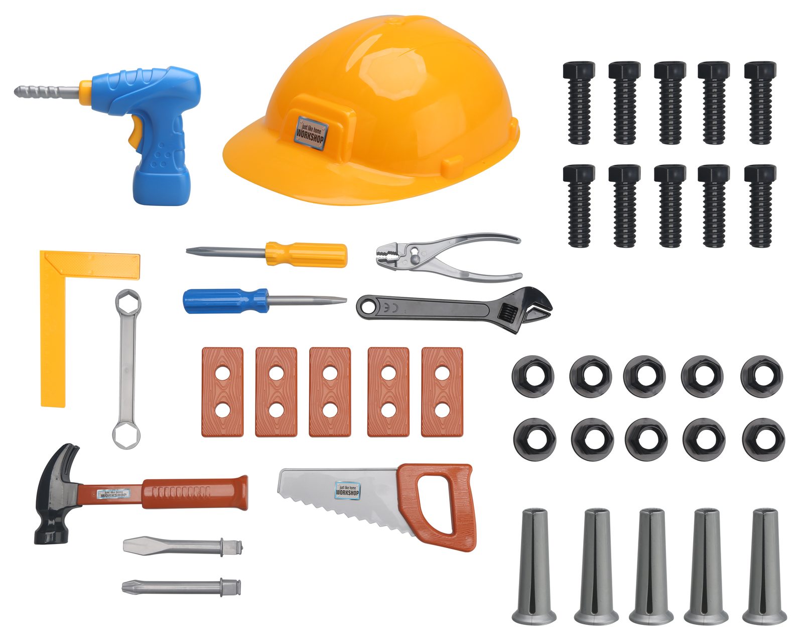 Sada pro malého opraváře obsahuje: helmu, vrtačku, šroubky a další příslušenství.