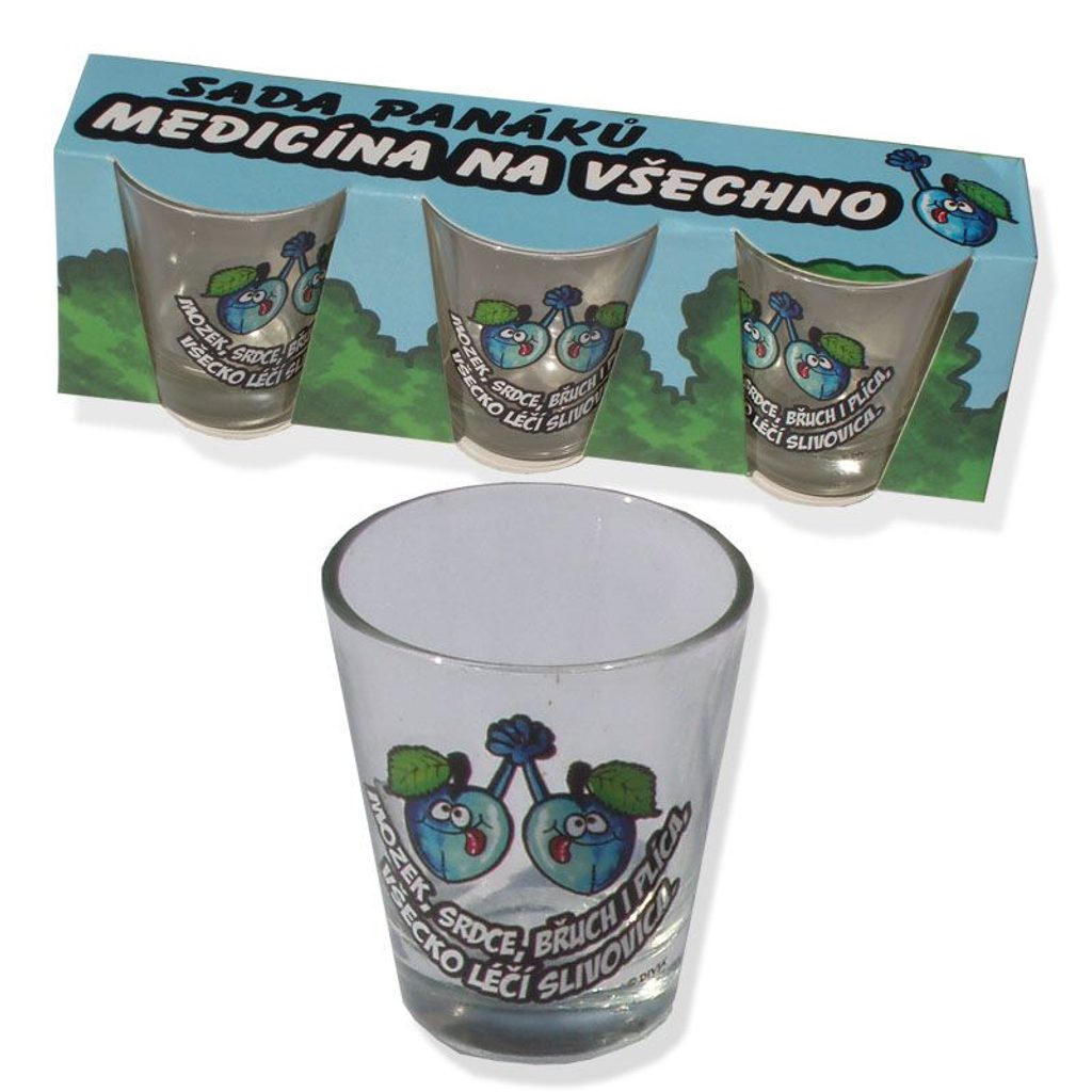 Sada panáků s názvem LÉK NA VŠECHNO obsahuje tři panákové skleničky s nápisem: "Mozek, srdce, břuch i plíca, všecko léčí slivovica". Tato sada je skvělým dárkem pro každého valašského milovníka slivovice. Tyto skleničky se Vám budou vyjímat na poličce.