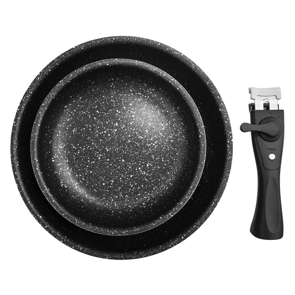 Sada 2 pánví s velmi kvalitním nepřilnavým povrchem PFLUON GRANIT a odnímatelná rukojeť. Můžete v nich vařit, smažit, dusit, opékat a zapékat s minimální potřebou tuku. Připravovaný pokrm se nepřipéká. Vhodné na všechny typy spotřebičů včetně indukce a trouby. Materiál: hliník s vynikajícím nepřilnavým povrchem PFLUON GRANIT a s profilovaným dnem, plast, kov, silikon. Rozměry: pr. 20 a 26 cm, v. 4,5 a 5 cm. U plynových sporáků volte správnou velikost plamene, u elektrických, sklokeramických a indukčních vařičů je nutné zvolit odpovídající velikost ploténky. Připravovaný pokrm lze na sporáku připravit a pak jej vložit do trouby. Připravené jídlo můžete pohodlně skladovat v pánvi také v chladničce. Lze mýt v myčce na nádobí.