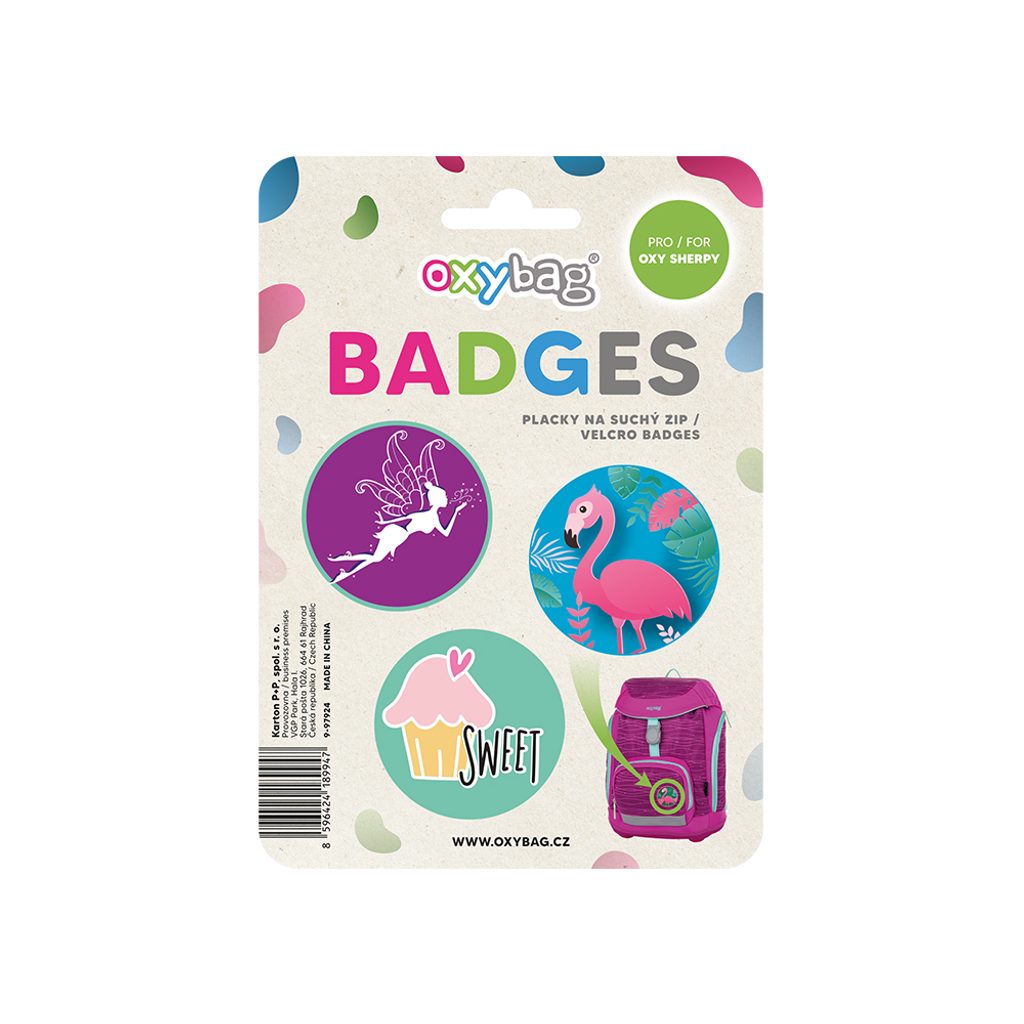 Tři vyměnitelné placky na suchý zip k ozdobení batohu OXY Sherpy.