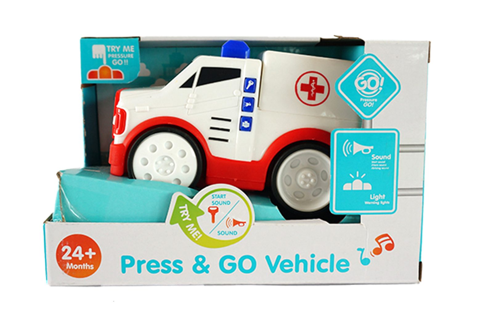 Plastové auto, velikost 15 cm. 3 zvuky, startování, houukání a zvuk motoru. Při stalečení majáku auto jede a maják svítí.