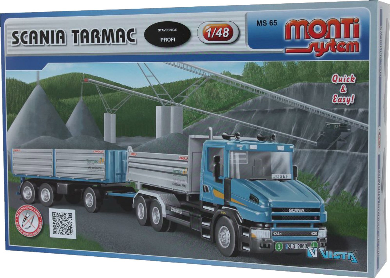 Model Scania MS 65 Tarmac s návěsem v měřítku 1:48. Obě korby jdou vyklápět, stejně tak i kapota motoru. Stavebnice patří do skupiny Profi.