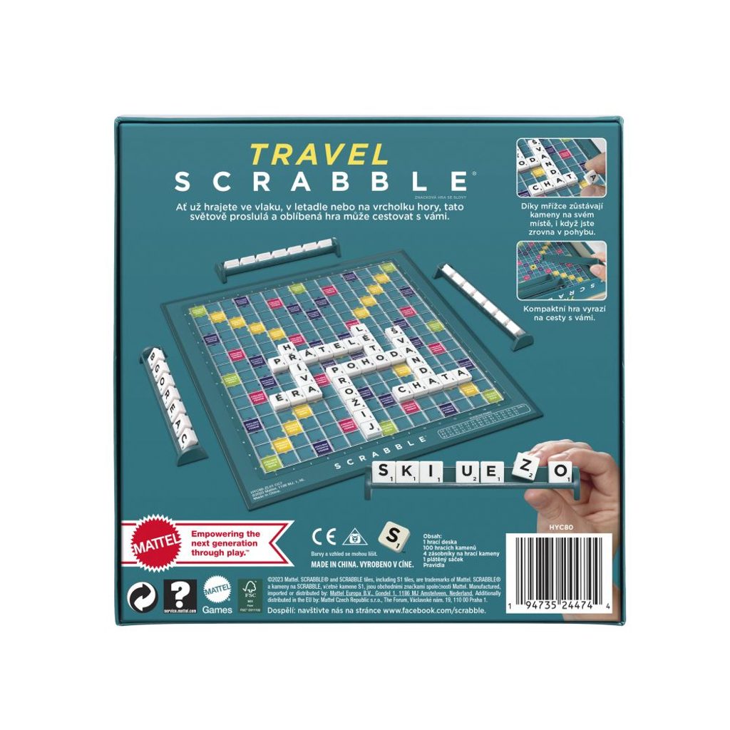 Strategická hra Scrabble™ nyní může cestovat s vámi! Ať už hrajete ve vlaku, v letadle nebo na vrcholcích hor, tato celosvětově oblíbená hra vás doprovodí kamkoli. Scrabble™ cestovní obsahuje klasickou hrací desku s mřížkou, která udržuje hrací kameny na svém místě - stačí přikládat jednotlivá písmena, když hláskujete další slovo. Získejte co nejvíce bodů skládáním slov z písmen na kamenech. Pak sledujte, jak se vaši protihráči tváří, když položíte kámen s daným písmenem na trojnásobné skóre slov! Kompaktní a přenosné, můžete být na cestách a hra se pohybuje s vámi! Hrát mohou 2-4 hráči. Součástí je hrací deska, 4 stojánky, 100 hracích kamenů s písmeny, sáček na hrací kameny a pravidla. Barvy a provedení se mohou lišit. Věk od 10 let.