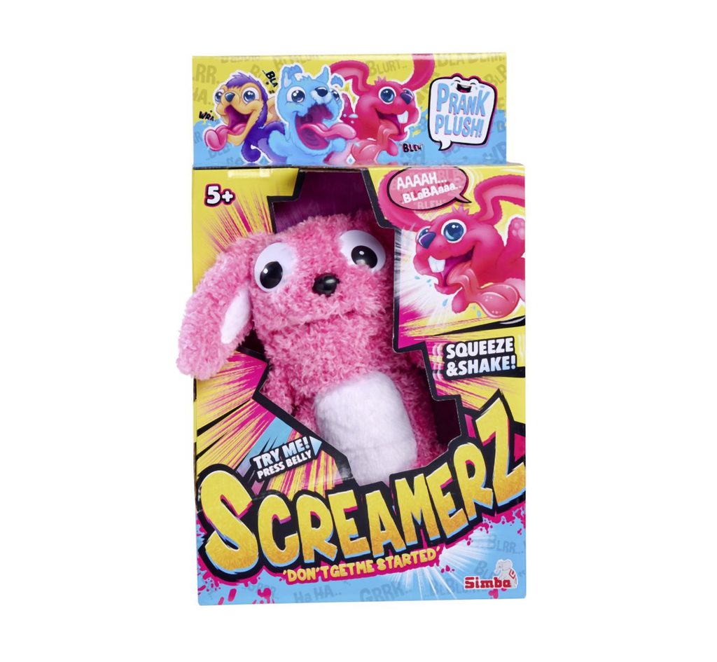 ScreamerZ, zábavný plyšák s bláznivýma očima a legračními zvukovými efekty. Lehce mu stiskni bříško a vydá roztomilý zvuk, stiskni více a začne křičet, stiskni ještě více a zatřepej s ním a on bude roztřeseně ječet. Velikost 30 cm. Barva růžová.