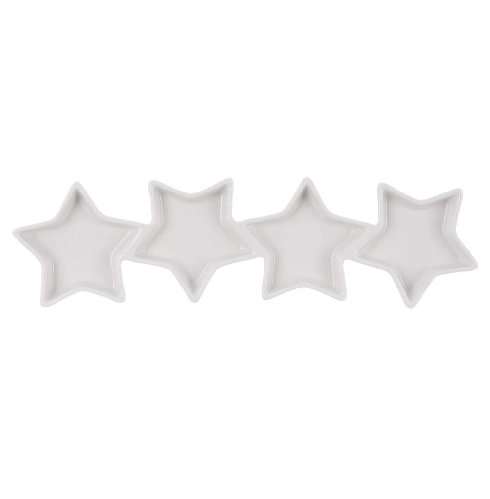 Tác ve tvaru hvězd je stylovým a praktickým doplňkem pro servírování oblíbených oříšků, čokolády a dalších pochutin. Je tvořen čtyřmi hvězdicovitými miskami, které jsou spojeny do jednoho celku, což vytváří originální a zároveň funkční design. Výrobek je vhodný do MVT a lze mýt v myčce nádobí. Materiál: porcelán. Rozměry: 29,5x8,5x2,1 cm, hvězda cca 8x8 cm.