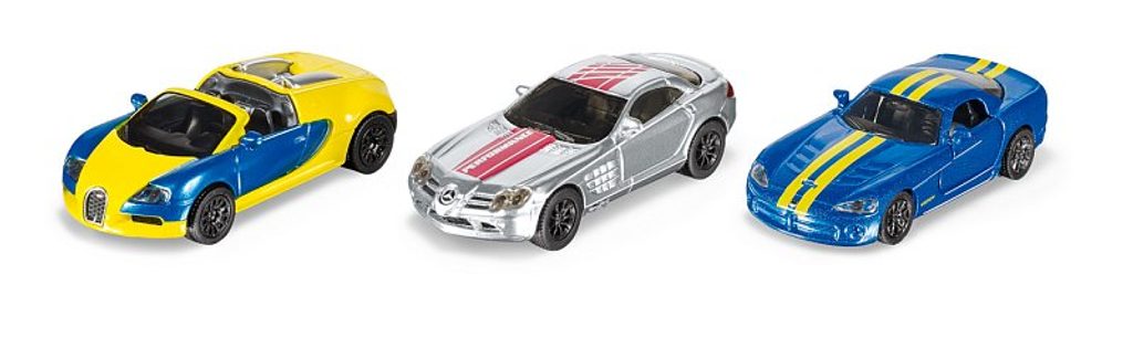 SIKU Super - Set sportovní auta. Kdo má nejrychlejší auto v garáži? Super sportovní auta jsou vždy připravena na závod. Bugatti Veyron, Mercedes-Benz McLaren SLS a Dodge Viper. Tyto super sportovní automobily s více než 2000 koňmi pod kapotou jsou již dlouho automobilovými legendami 21. století. Při zrychlení zůstávají na asfaltu stopy po gumách. Trio aut má nápadné lakování což jim dodává agresivní vzhled. Dveře desetiválcového monstra Dodge Viper se mohou doširoka otevřít, aby vás nalákaly k dalšímu souboji. Rozměr balení: 17 x 10 x 5,7 cm. Věk: 3+.