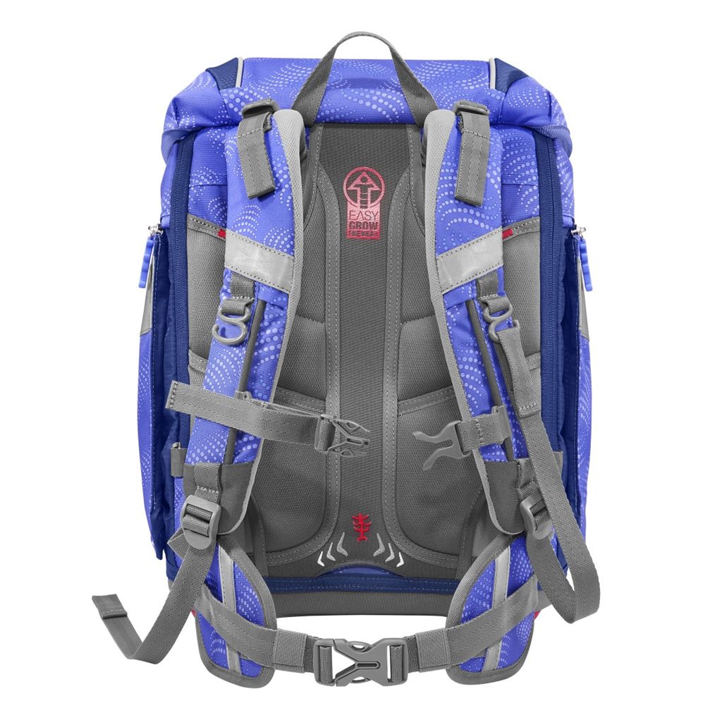 - možnost plynulého výškového nastavení ramenních popruhů pomocí otočného mechanismu uvnitř aktovky, zajišťuje přesné nastavení ramenních popruhů přímo na zádech dítěte