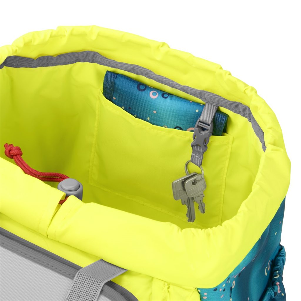 - v klopě gumičky pro umístění penálu, zatíží batoh z vrchu a tak chrání záda a zároveň šetří prostor v batohu