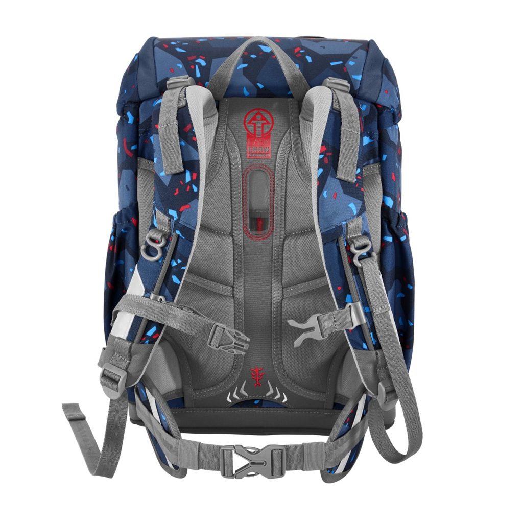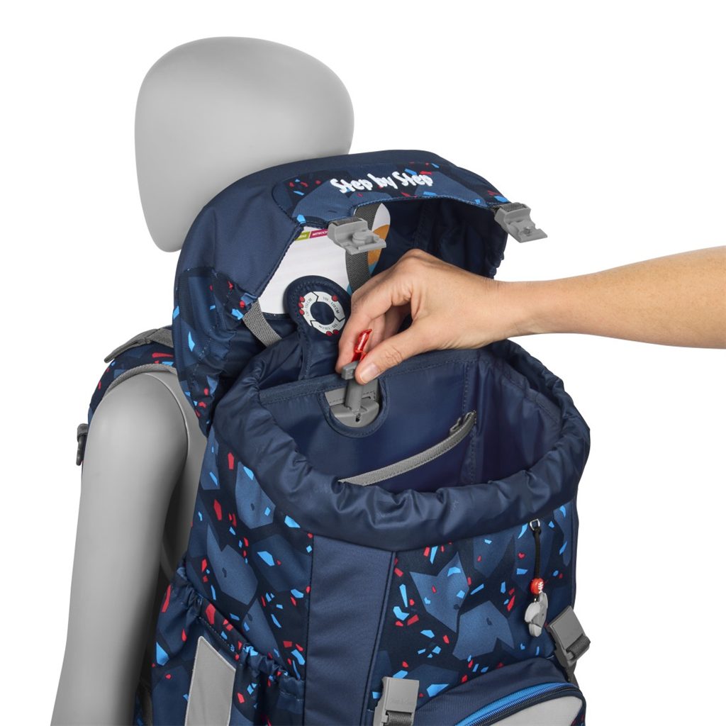 - pomocí otočného mechanismu uvnitř batohu, zajišťujete přesné nastavení ramenních popruhů přímo na zádech dítěte od 1. Do 4. třídy