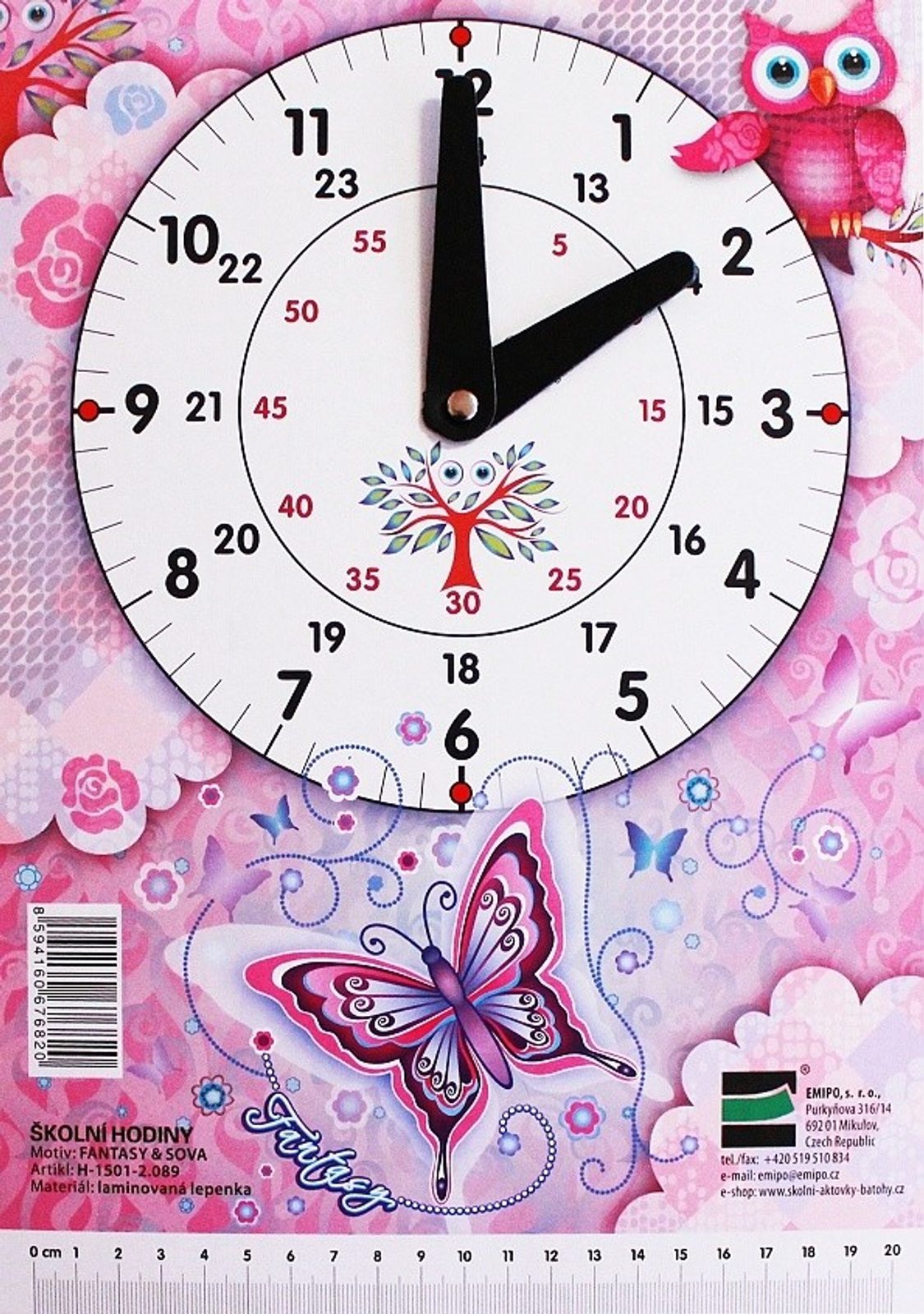 Školní hodiny slouží k výuce času prvňáčkům základních škol. Ve spodní části hodin je pravítko, které se může odstřihnout a používat samostatně.