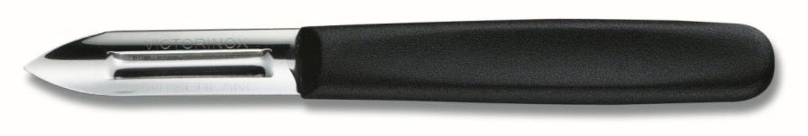 Oboustranná škrabka na brambory a jiné tvrdné druhy ovoce a zeleniny s ostrou čepelí a hrotem, díky kterému snadno odstraníte všechny vady.