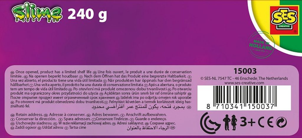 Sliz se třpytkami. Výrobek obsahuje dva kelímky slizu s různou hustotou a barvou. Sliz je velmi populární! Při výrobě slizu SES je kladen důraz na 100% bezpečnost a nejvyšší kvalitu. Sliz SES je vyráběn ve vlastní továrně v Enschede v Holandsku. Splňuje všechny bezpečnostní normy hraček. Slizy SES jsou bezpečné, snadno omyvatelné, bezlepkové a je s nimi skvělá zábava! Slizy SES mají dvě různé hustoty, mnoha barev, vůní, třpytek a dalších doplňků. Věk: 3+. Rozměr balení: 15 x 5,5 x 7 cm. Váha: 0,27 kg.