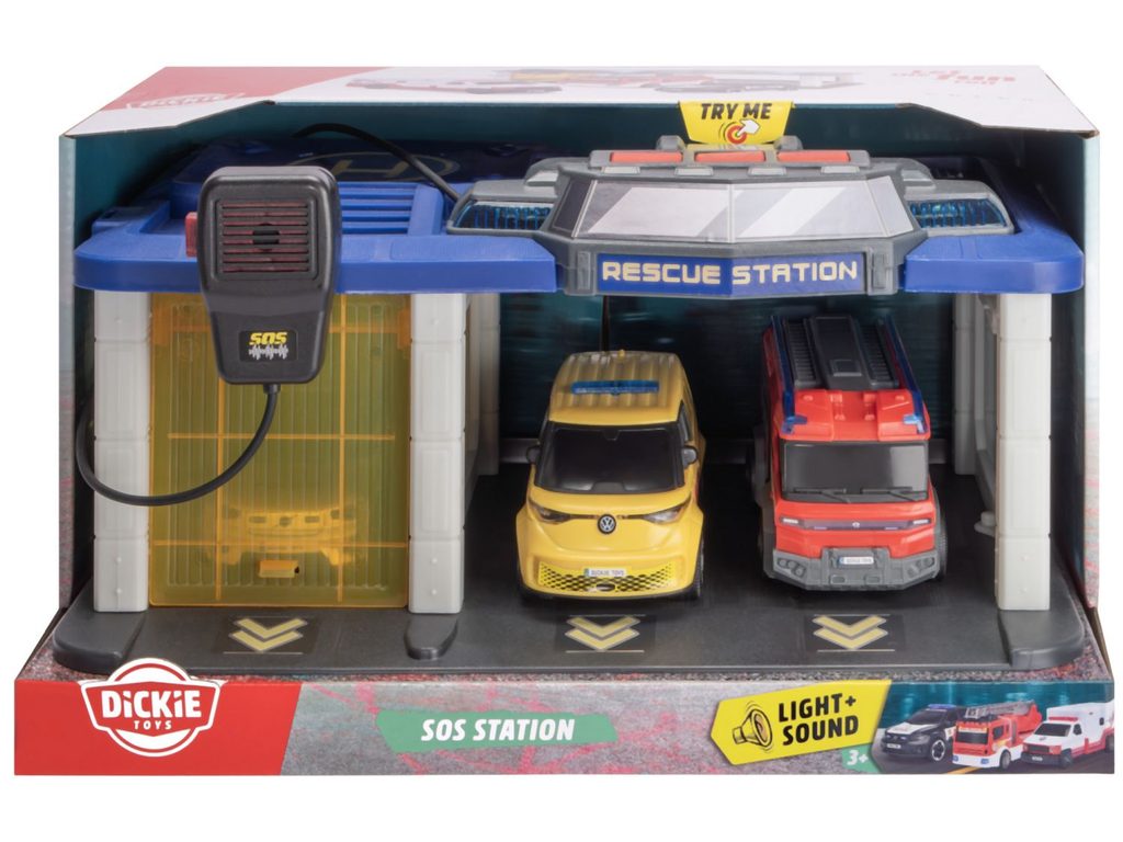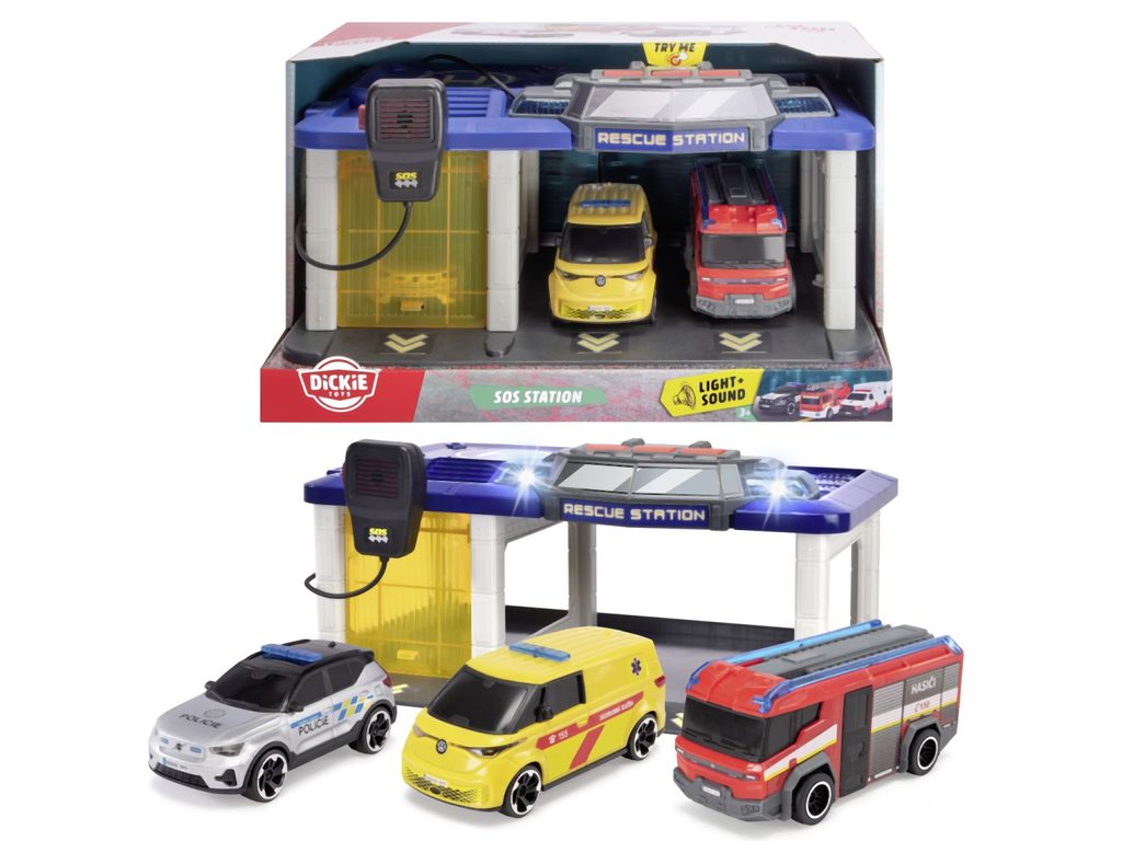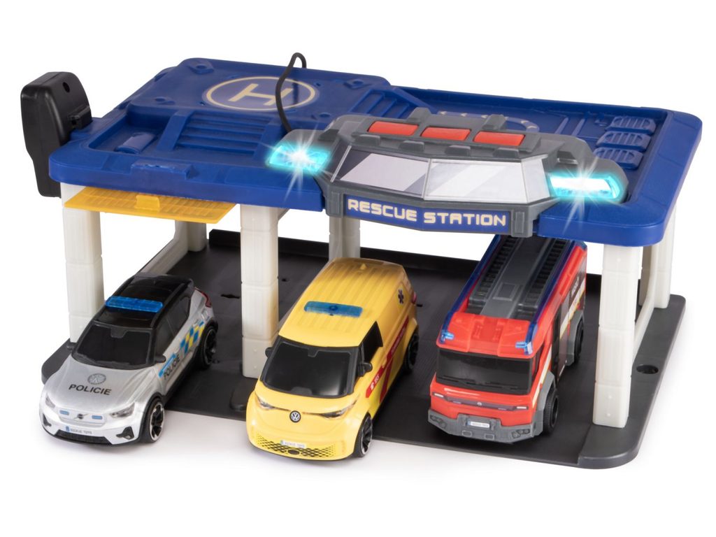 SOS Záchranářská stanice se světlem, zvukem, funkčním mikrofonem a otevíracími vraty. Hasičské auto (Rosenbauer Penta), policejní auto (Volvo XC40 Recharge) a ambulance (Volkswagen ID. Buzz) - auta na volnoběh. Rozměry 31 x 22 x 16 cm. Česká verze.
