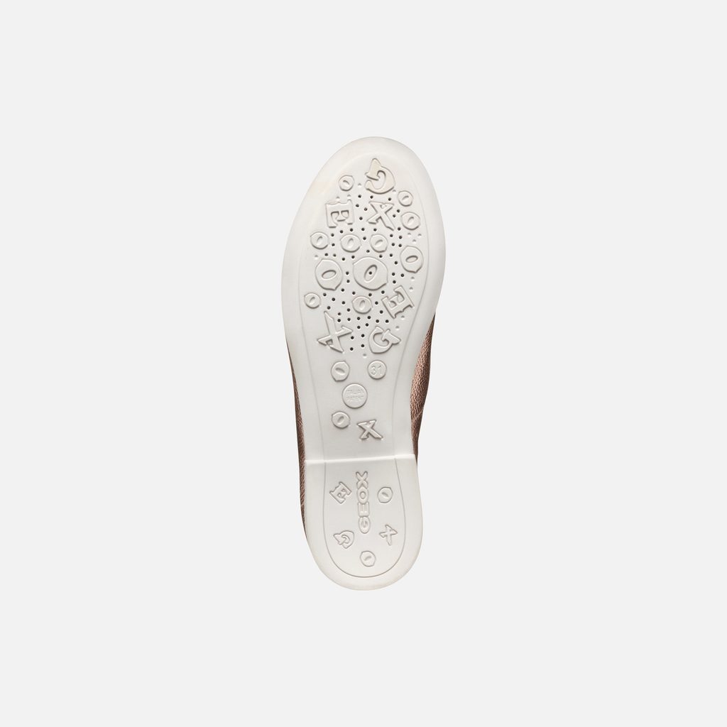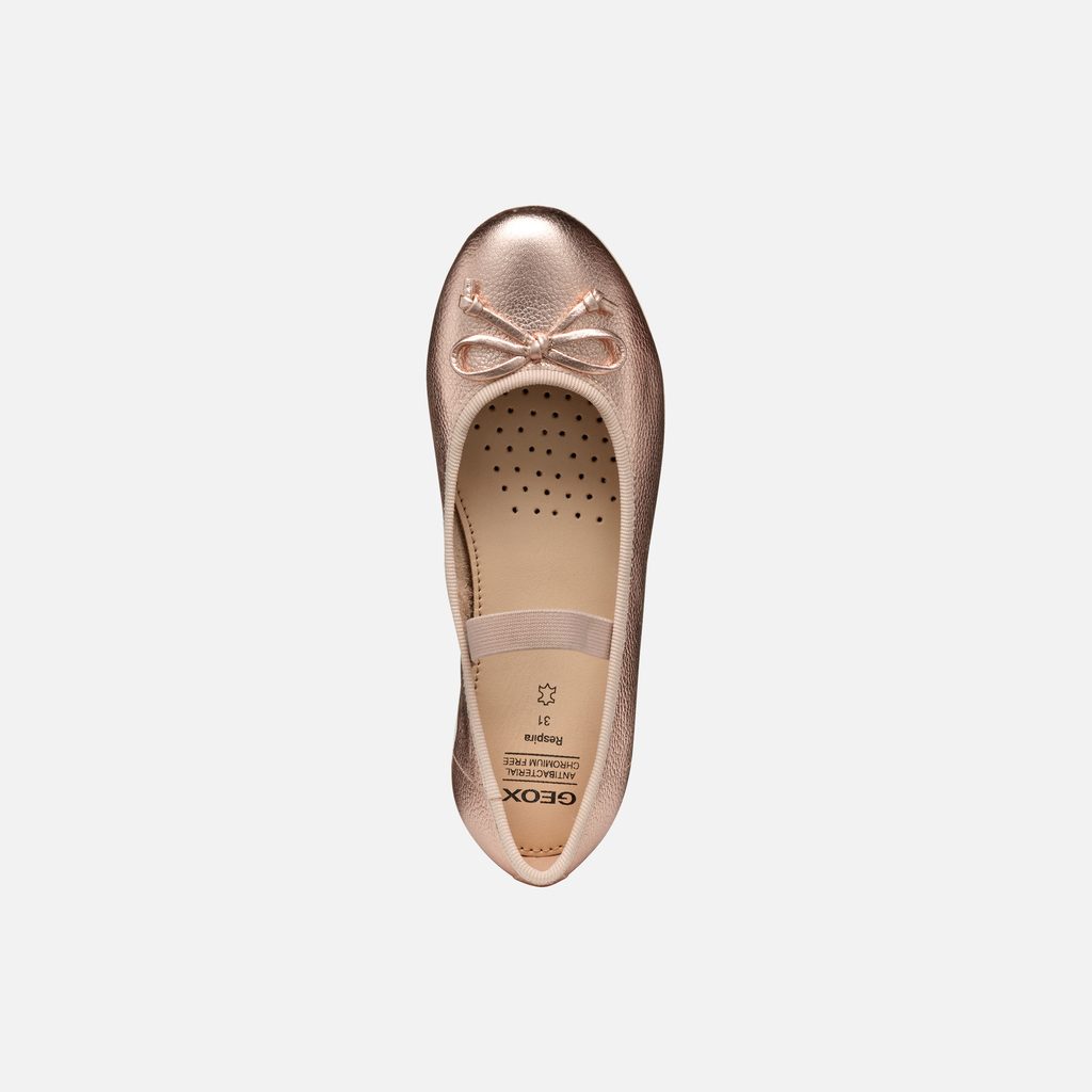 Staroružové dívčí baleríny Geox vynikají elegantním metalickým odstínem a nadčasovým designem. Přední část zdobí dekorativní mašle ze stejného materiálu, zatímco elastický pásek přes nárt zajišťuje lepší fixaci nohy. Zaoblená špička a nízký profil vytváří klasický vzhled baletek.