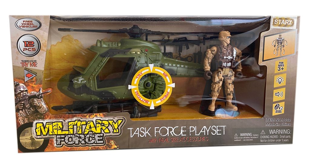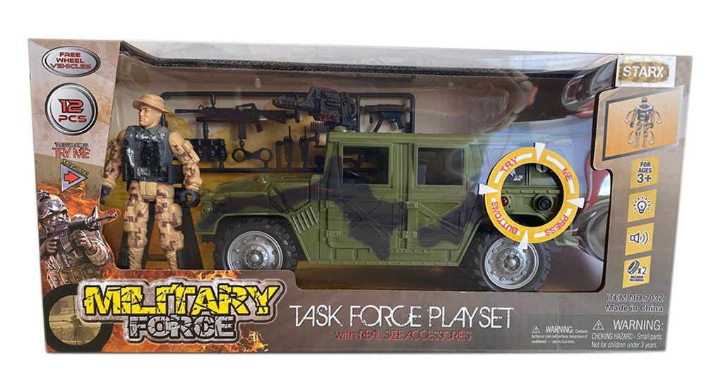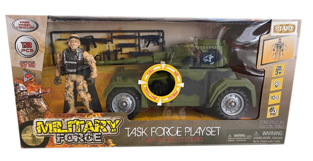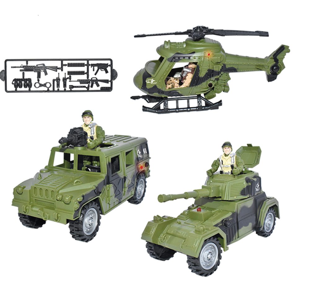 Vojenská sada se světelnými a zvukovými efekty. Obsahuje vojenské vozidlo nebo helikoptéru, postavičku vojáka a další příslušenství. Vojenská sada se světelnými a zvukovými efekty. Obsahuje vojenské vozidlo nebo helikoptéru, postavičku vojáka a další příslušenství.
