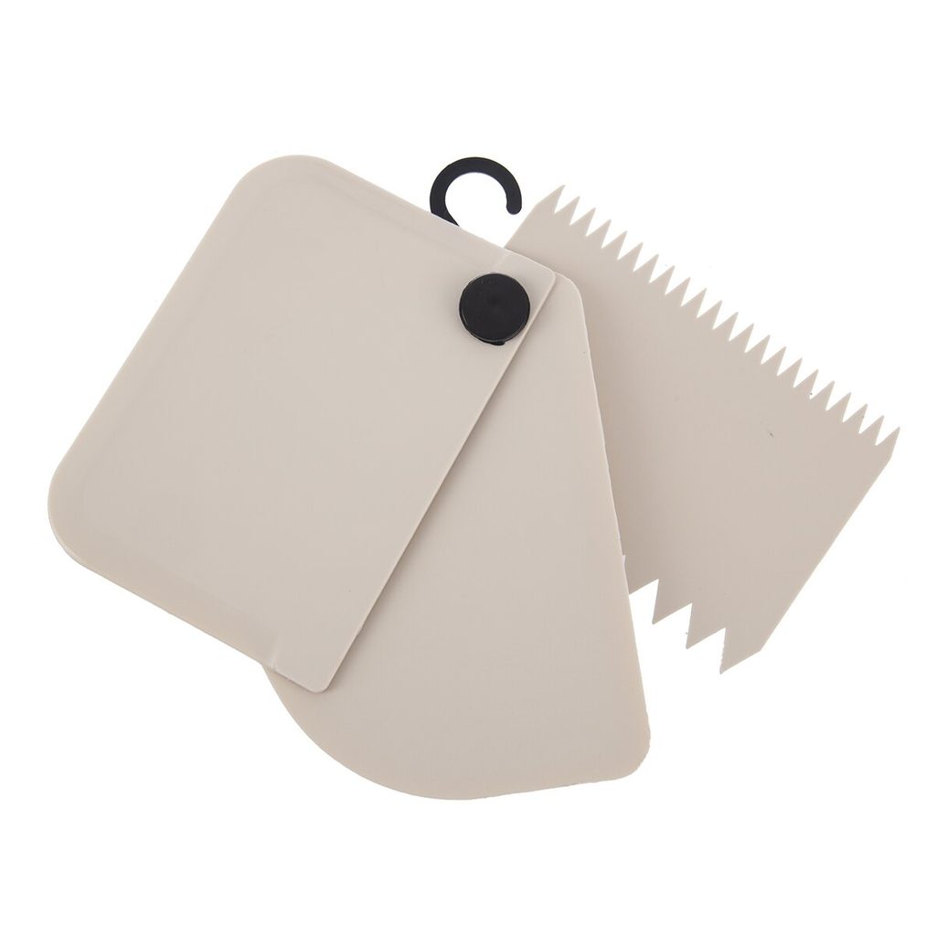 Stěrky využijete pro zdobení dortů a zákusků, při práci s krémem, čokoládou nebo těstem, při vaření, pečení i úpravě jídel. Hladkou cukrářskou kartou docílíte precizně zarovnaného krému na dortu. Pokud použijete zubatou kartu, můžete mít na povrchu krému nebo čokolády plastický vzor. Skvělým pomocníkem je hladká stěrka při rozdělování těsta, při přenášení nakrájené zeleniny z prkénka do nádoby. Hladké také pomohou dokonale vyprázdnit misku od pomazánky nebo hrnce od zbytků jídla. Skvěle padnou do ruky. Materiál: plast PPR. Max. teplota +90 °C. Sada 3 ks. Rozměry: zubatá 11x8 cm, obdélníková 12x8,5 cm, oblá 12,5x9,5 cm. Lze je mýt v myčce.