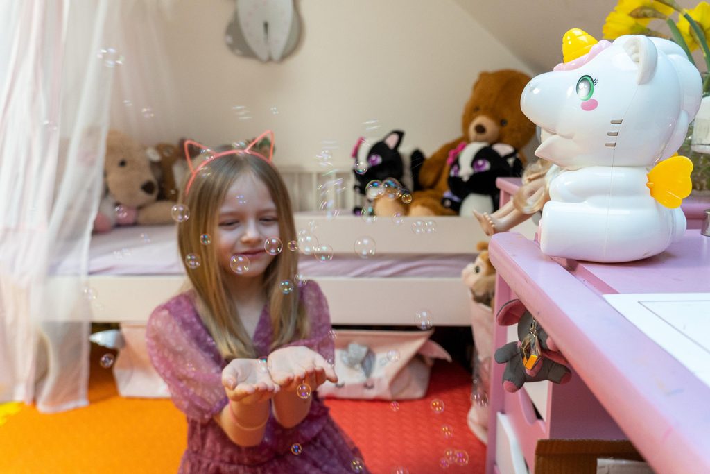 Záplava bublin. Stroj na bubliny, který je poháněn bateriemi a chrlí bubliny.