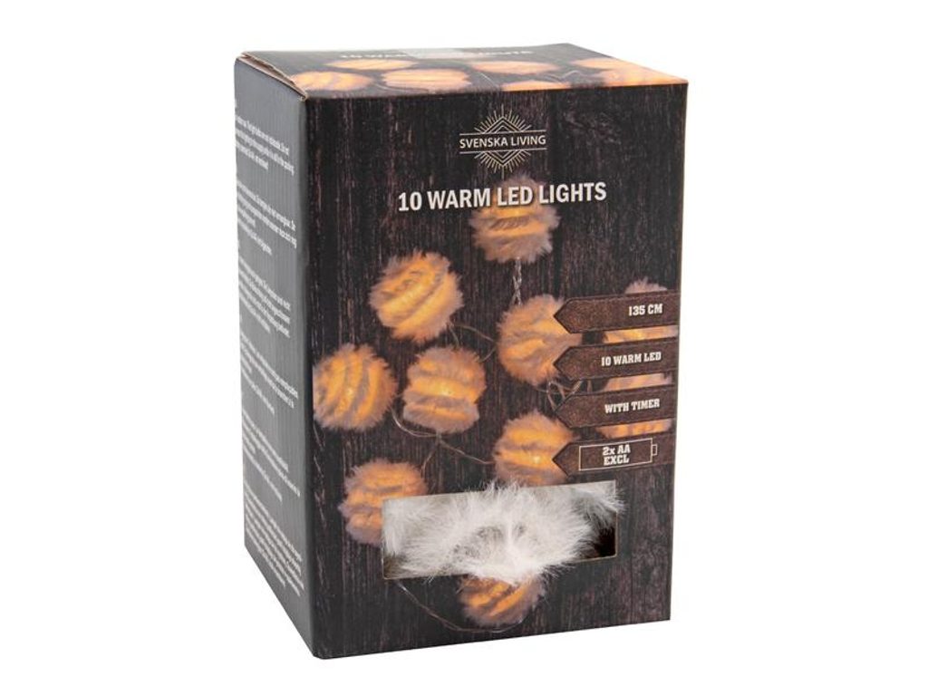Vánoční světelný řetěz 10 LED koule pírka s časovačem 1,35 m, teplé světlo. OSVĚTLENÍ VÁNOČNÍ KOULE PÍRKO LEDX10 ČASOVAČ 2XAA