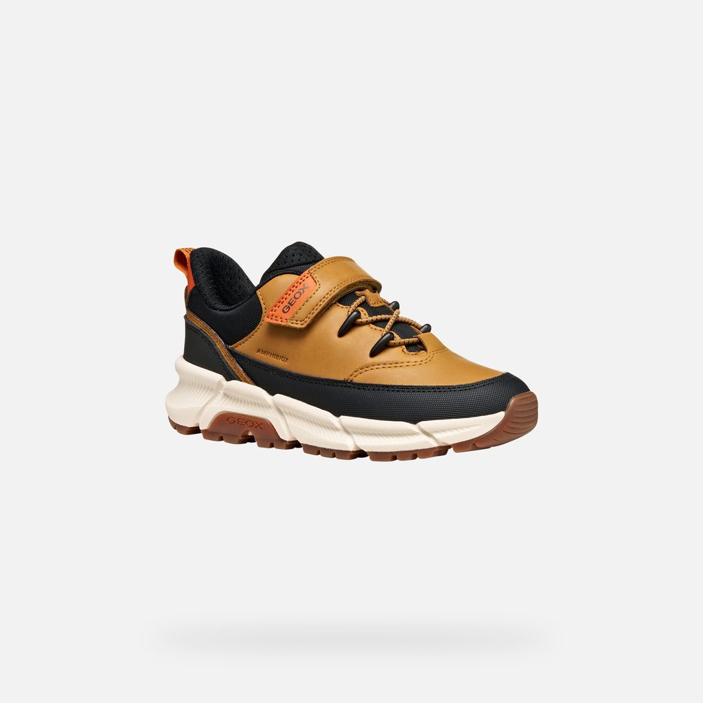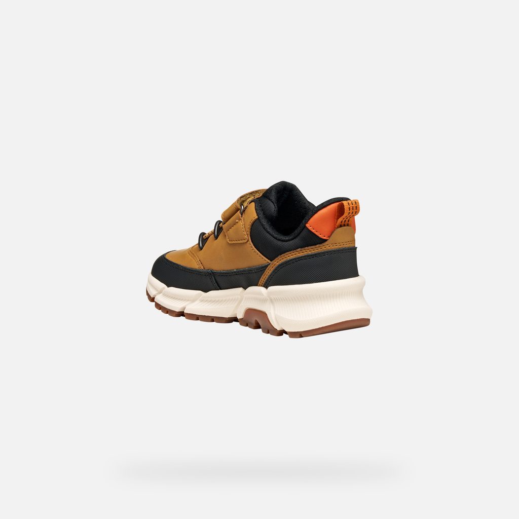 Světle hnědé chlapecké tenisky Geox Flexyper Plus zaujmou svým moderním designem s černými detaily a praktickým suchým zipem v oranžové barvě. Výrazným prvkem je texturovaný vzor na patě a v oblasti tkaniček, doplněný o praktické poutko pro snadné obouvání.